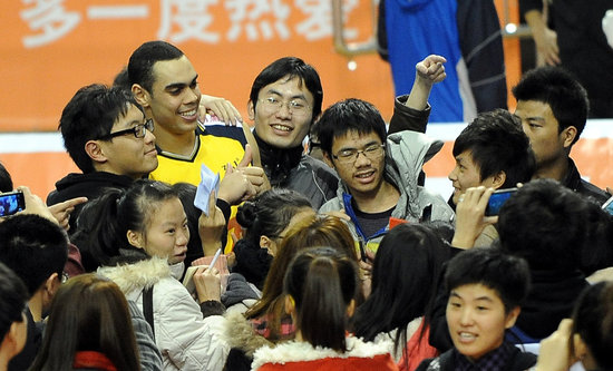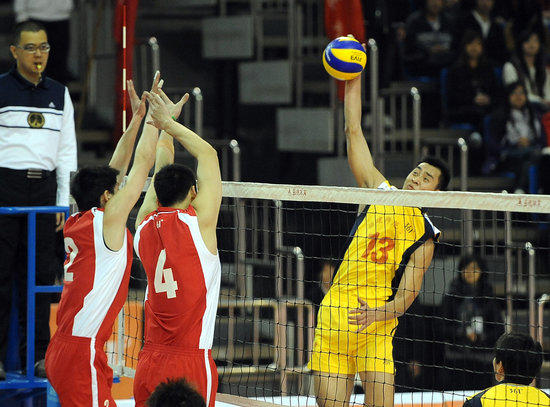 我校学生球迷向男排队员表示祝贺