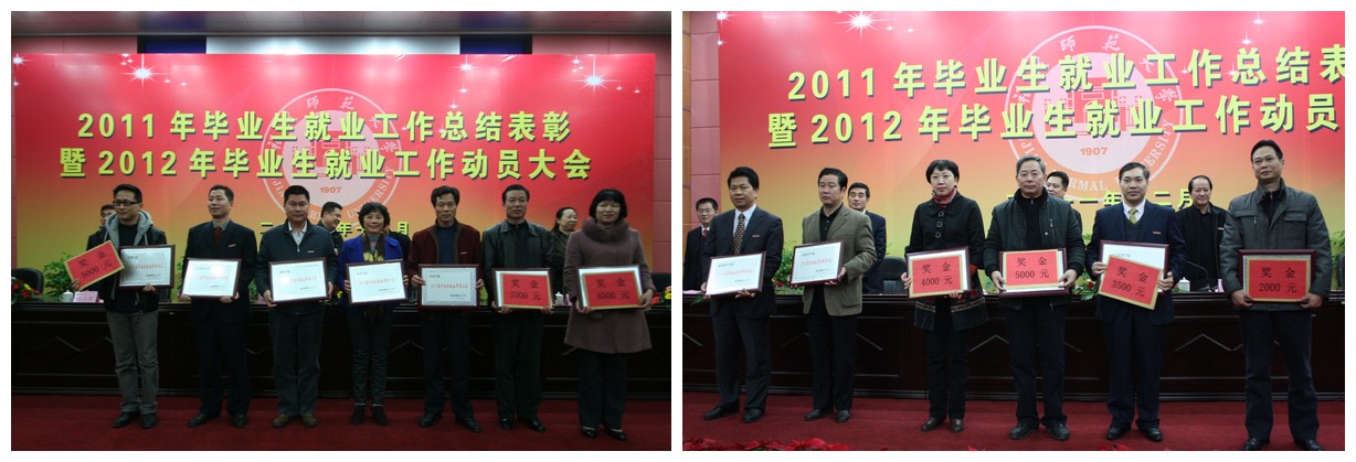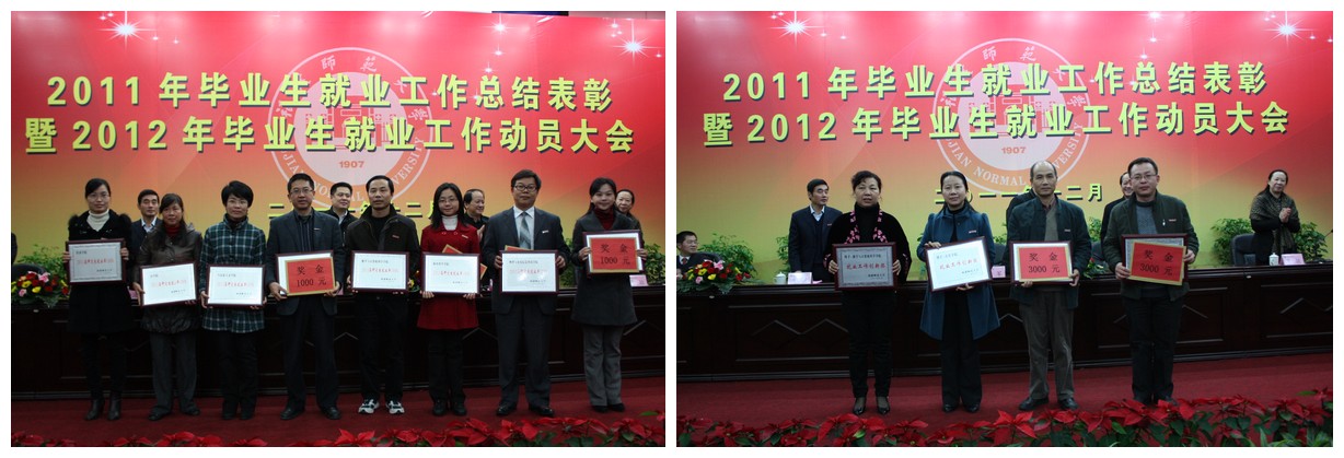 大会对2011年本专科毕业生就业率前六名的旅游学院、软件学院、经济学院、人民武装学院、信息技术学院、传播学院、福清分校,对2011年本专科毕业生签约率前六名的社会历史学院、法学院、人民武装学院、生命科学学院、地理科学学院、公共管理学院,对2011年本专科毕业生就业率增幅前6名的专业,对2011年毕业研究生就业率100%的8个学院,对2011年本专科毕业生一次性就业率超过80%且年终就业率达100%的39个专业,对获得2011年就业工作创新奖的地理科学学院、音乐学院、外国语学院、数学与计算机科学学院,对获得“2010—2011学年毕业生就业工作贡献奖”的涂秀虹等16位同志,对获得“2010—2011学年毕业生就业工作先进个人”的苏杭等27位同志进行了表彰奖励。