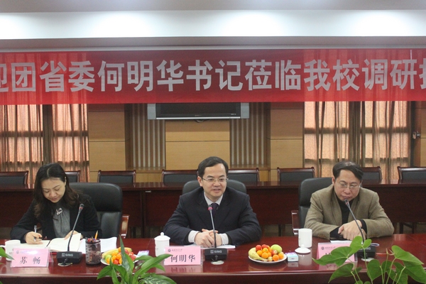 3月2日上午,团省委主持工作副书记何明华在团省委常委、办公室主任吴建铭和学校部部长苏畅的陪同下,莅临我校调研指导。校党委书记罗萤、副校长凌启淡,学校办公室、校团委负责人和学生代表参加了调研。