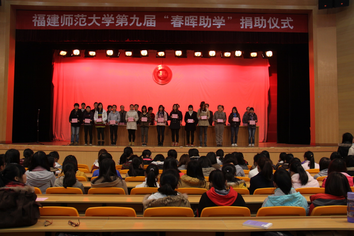 捐助仪式于3月14日在旗山校区举行,共有105位同学获得每人800元的资助。省总工会党组纪检组长、女工委主任高榕,省总工会女职工部部长张红璇,福州市总工会直属工会主席侯贞诚、副主席潘孝平、女工委主任郑琦,省电力实验研究院工会女工委主任陈伟,中国邮政储蓄银行福州分行纪委书记、工会主席翁绳雄,福州市世腾汽车销售有限公司总经理单苏平,我校纪委书记、工会主席许歌平,校工会、学工部、校团委负责人,校女工委全体委员、各部门工会女工委员和学生代表600余人参加了捐助仪式。