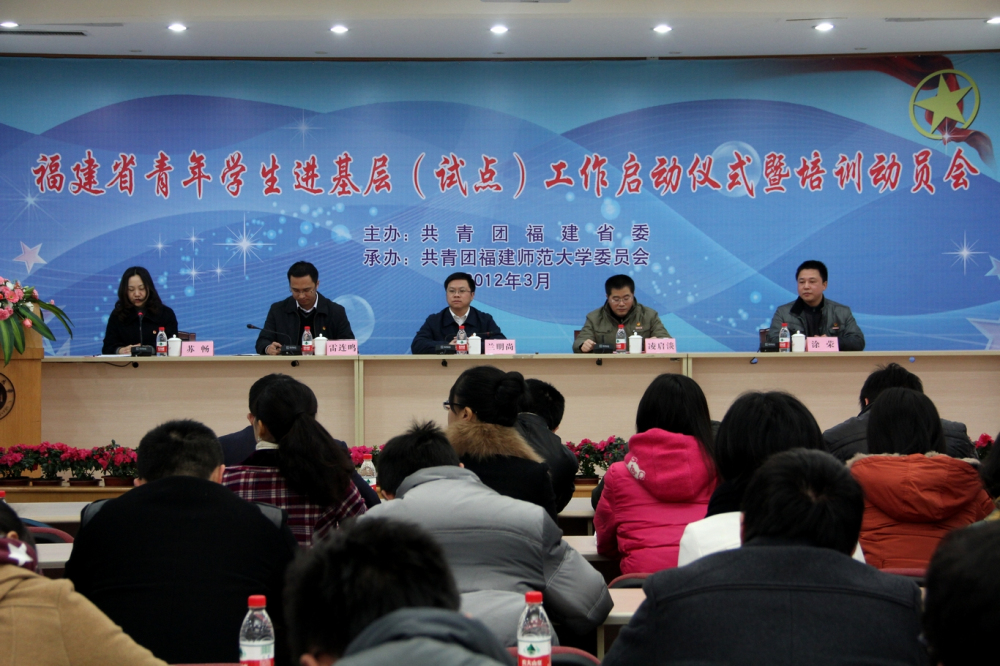 3月14日下午,福建省青年学生进基层(试点)工作启动仪式暨培训动员会在旗山校区第九会议室举行。团省委副书记兰明尚,福州团市委副书记雷连鸣,副校长凌启淡,校团委负责人等出席启动仪式。闽侯团县委、仓山团区委、对接乡镇村、非公企业代表,我校各学院团委书记和全体挂职学生,福州大学至诚学院、福建信息职业技术学院团委负责人及挂职学生代表共200余人参加了启动仪式。仪式由团省委学校部部长苏畅主持。