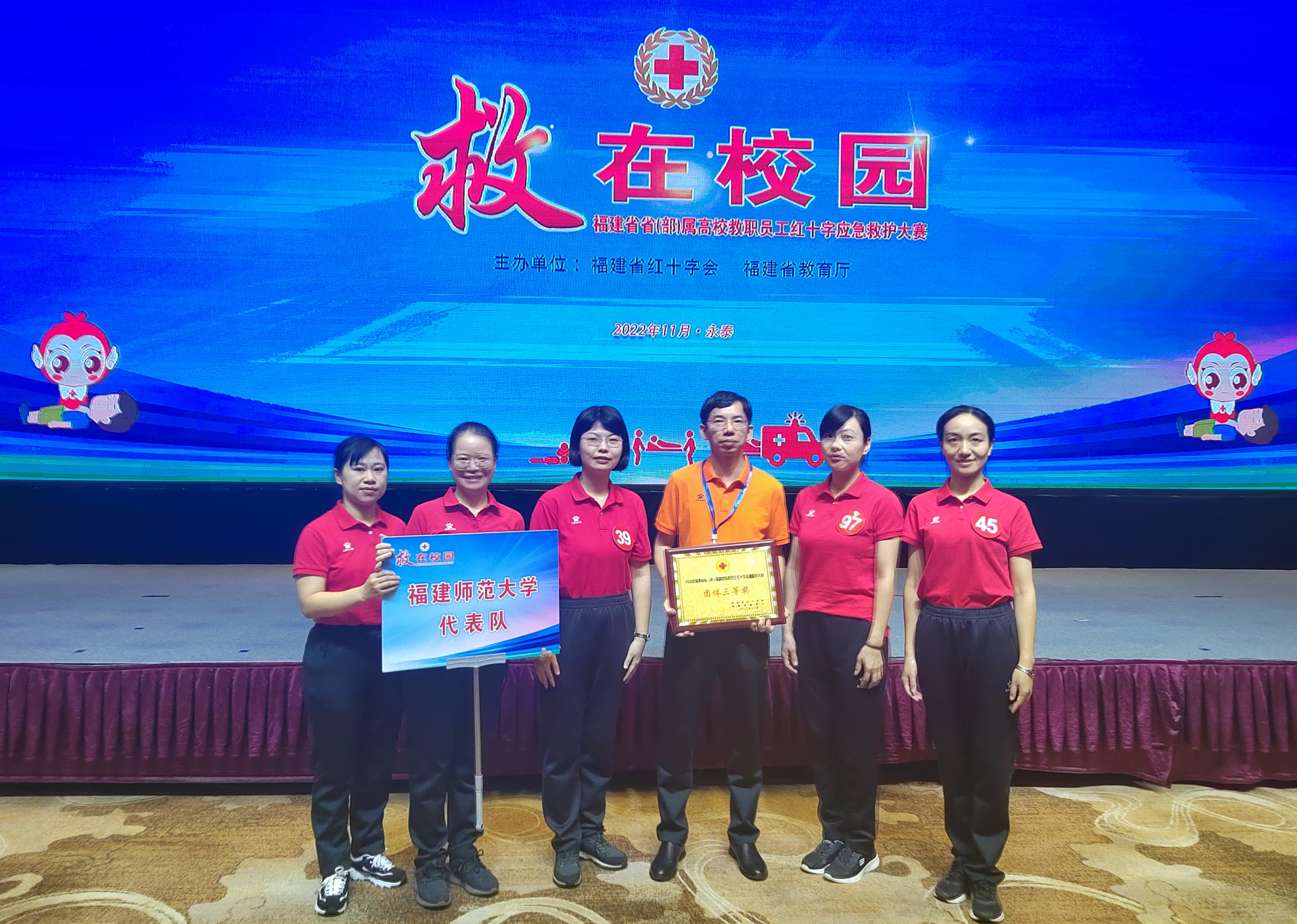 11月29日,由省红十字会、省教育厅联合举办的省(部)属高校教职员工红十字应急救护大赛在福州永泰举行。校医院5位医护人员代表学校参赛,并获团体三等奖,李敏同志获个人单项奖(创伤救护)、个人综合奖。