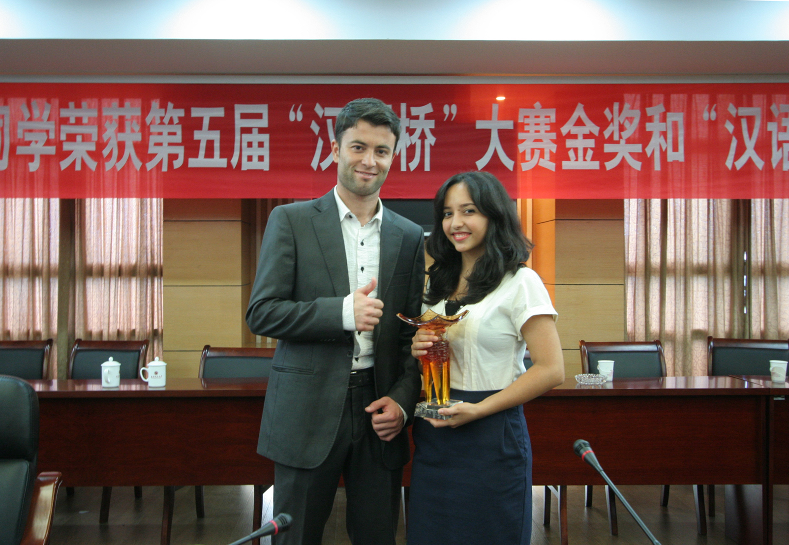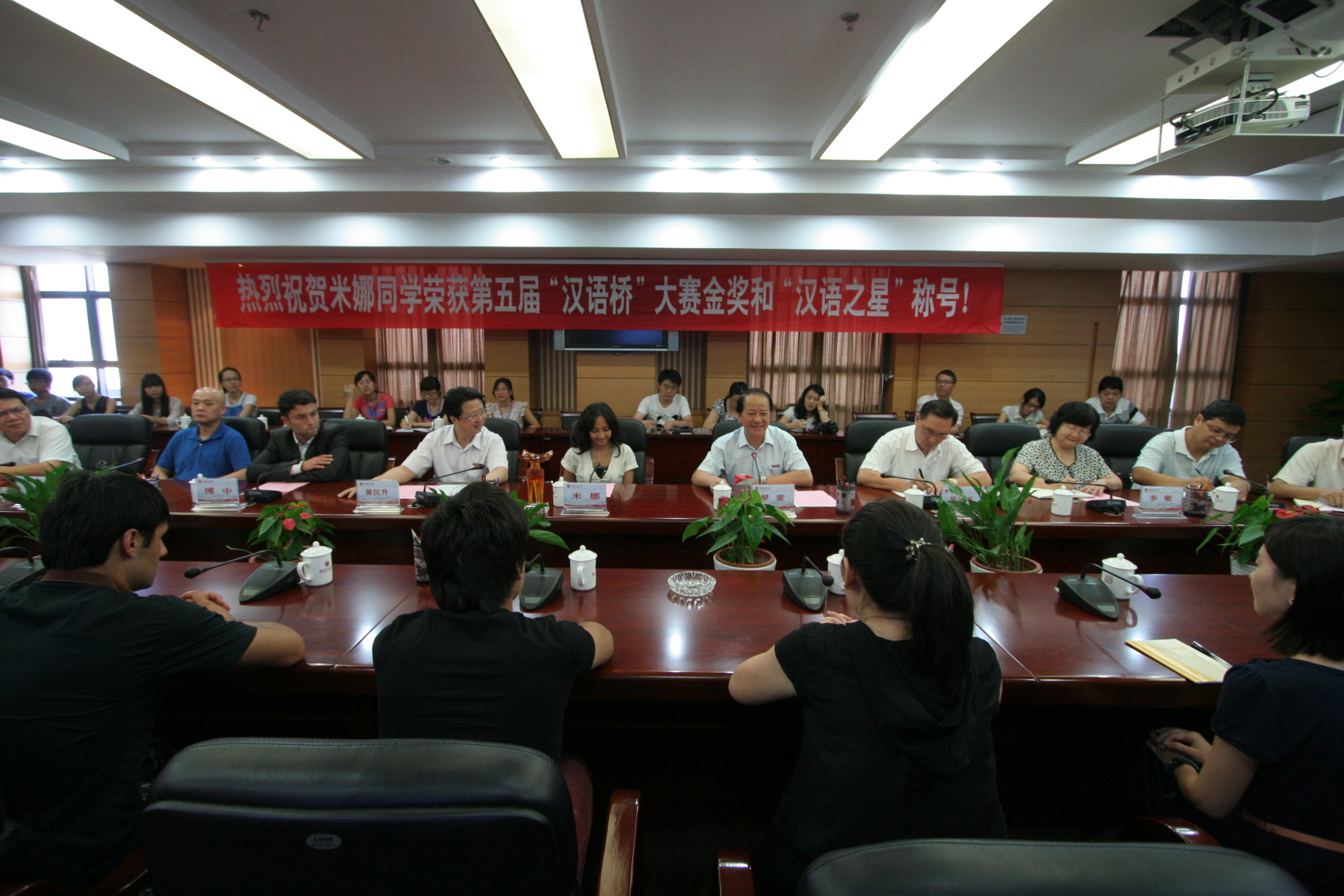 米娜的汉语指导老师以及海外教育学院负责同志作了发言,与会同学纷纷对米娜和博中同学表达了衷心的祝贺,并表示一定会向他们学习,珍惜学习机会,勤奋刻苦,奋发进取。我校许多同学也纷纷在微博上表达了祝贺和骄傲之情。