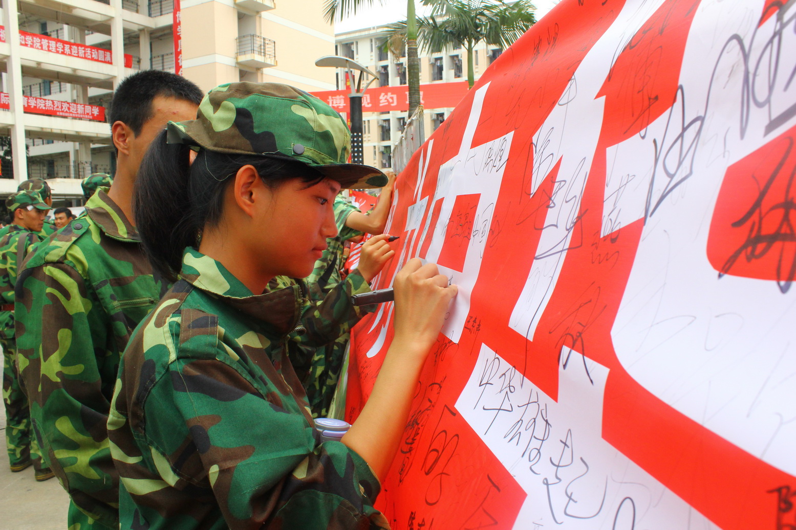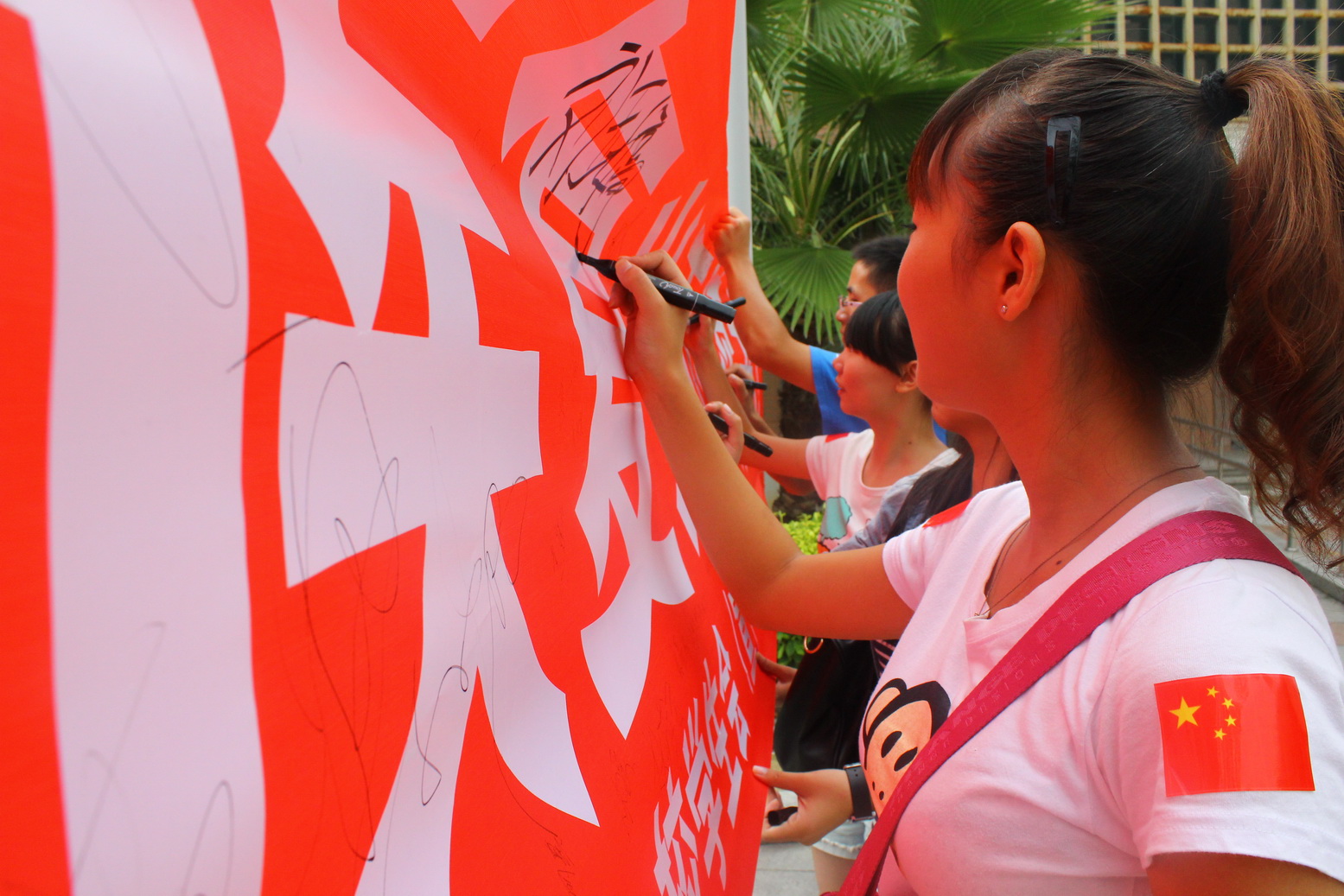 上午8时许,由校团委联合各学院发起的“理性爱国,避免盲从,我爱钓鱼岛”爱国签名活动在旗山校区和仓山校区同时开展。在签名现场,校学生会向广大同学发放10000份国旗贴纸,同学们把五星红旗贴在自己胸前和手臂上,不约而同地签上了“钓鱼岛是中国的”、“勿忘国耻”、“理性爱国”等话语,依法理性表达自己的爱国情怀。11点多,校党委罗萤书记和黄汉升校长也来到旗山校区共青团广场,与广大学生一起参与爱国签名活动、交流爱国情感并合影留念。在此前的17日晚,校学生会以“爱国微倡议”为话题发布微博,呼吁师大人“依法爱国,理性爱国,爱国更应为中华民族复兴而读书”,许多同学纷纷转发并评论。