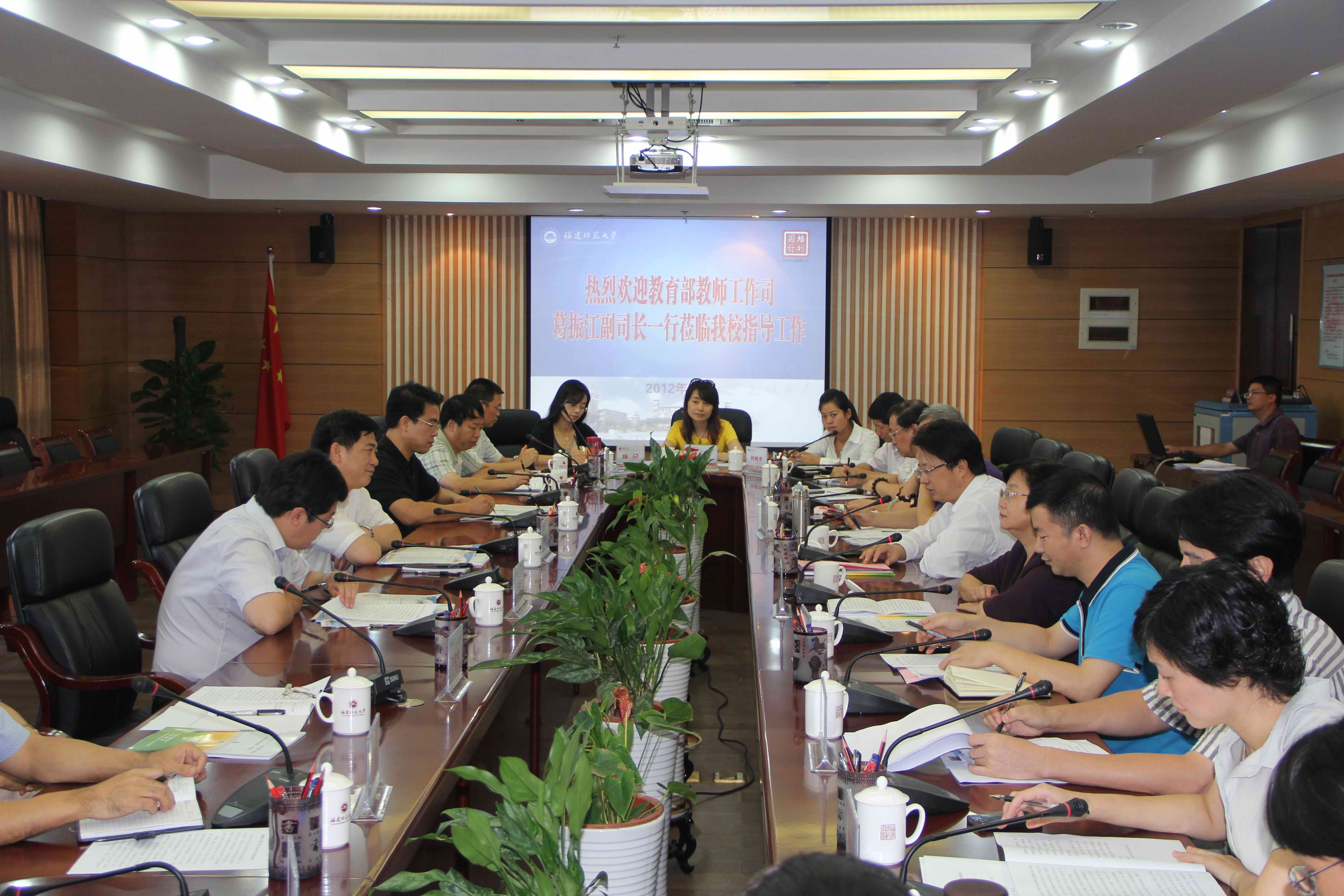 9月20日,教育部教师工作司葛振江副司长、教师工作司培训处王炳明博士,在福建省教育厅人事处高培青调研员的陪同下,莅临我校调研指导“国培计划(2012)”培训项目执行工作。黄汉升校长、李敏副校长,学校办公室负责人,国培计划(2012)项目具体执行单位教师教育学院、教育学院、体育科学学院、音乐学院、网络教育学院领导、项目负责人,校内外专家代表、学员代表出席了座谈会。座谈会由李敏副校长主持。