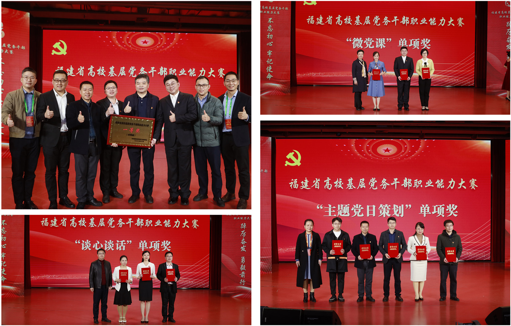 12月13日,全省高校基层党务干部职业能力大赛在福州大学举行。我校参赛团队由法学院周延锋、文学院杨祖荣、马克思主义学院朱国鹏3位老师组成,经过紧张激烈角逐,以总分第二名荣获本科组一等奖,同时获3个赛项单项奖,其中杨祖荣获“微党课”第一名、周延锋获“谈心谈话”第二名、团队获“主题党日策划”第八名。