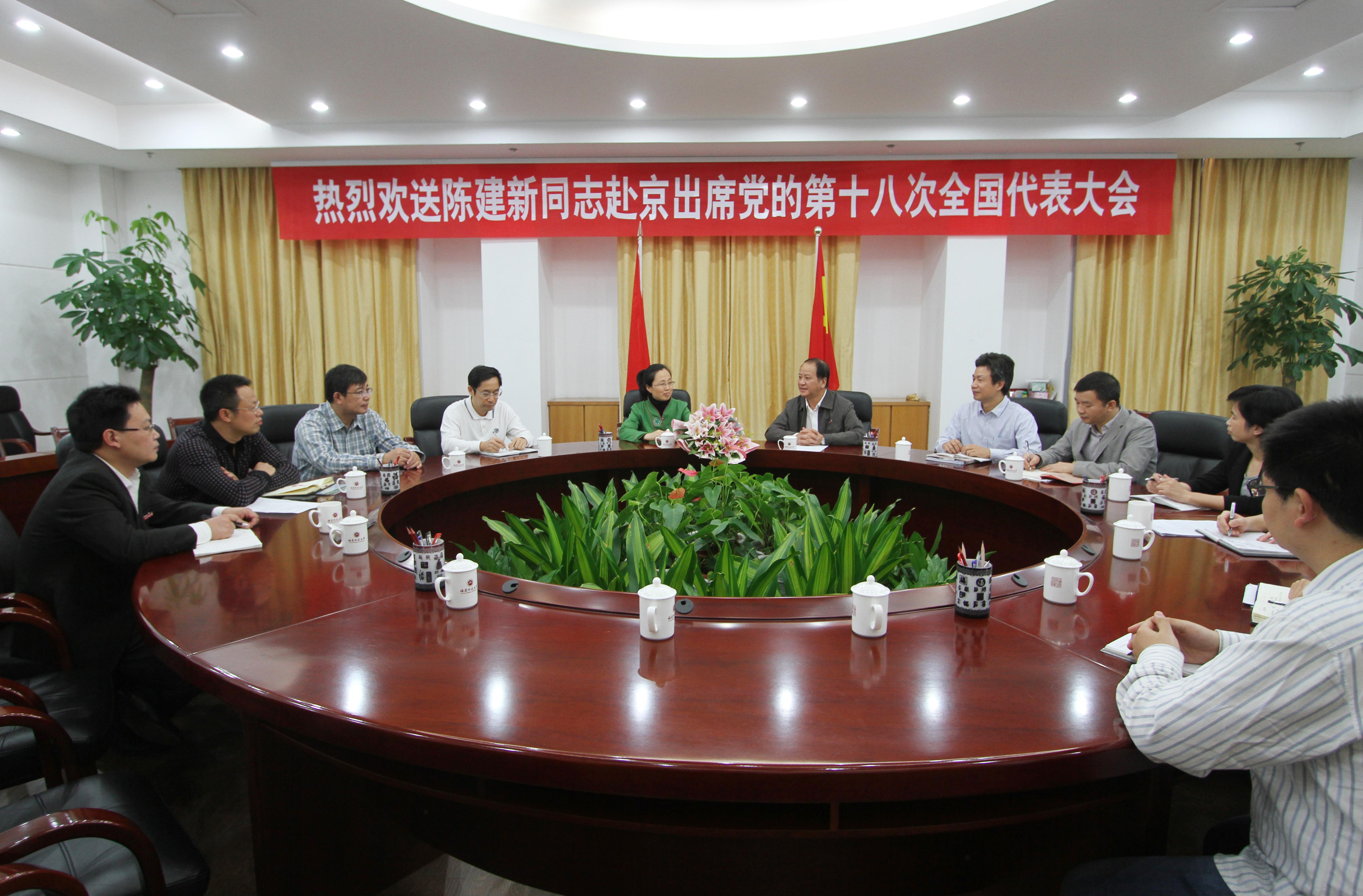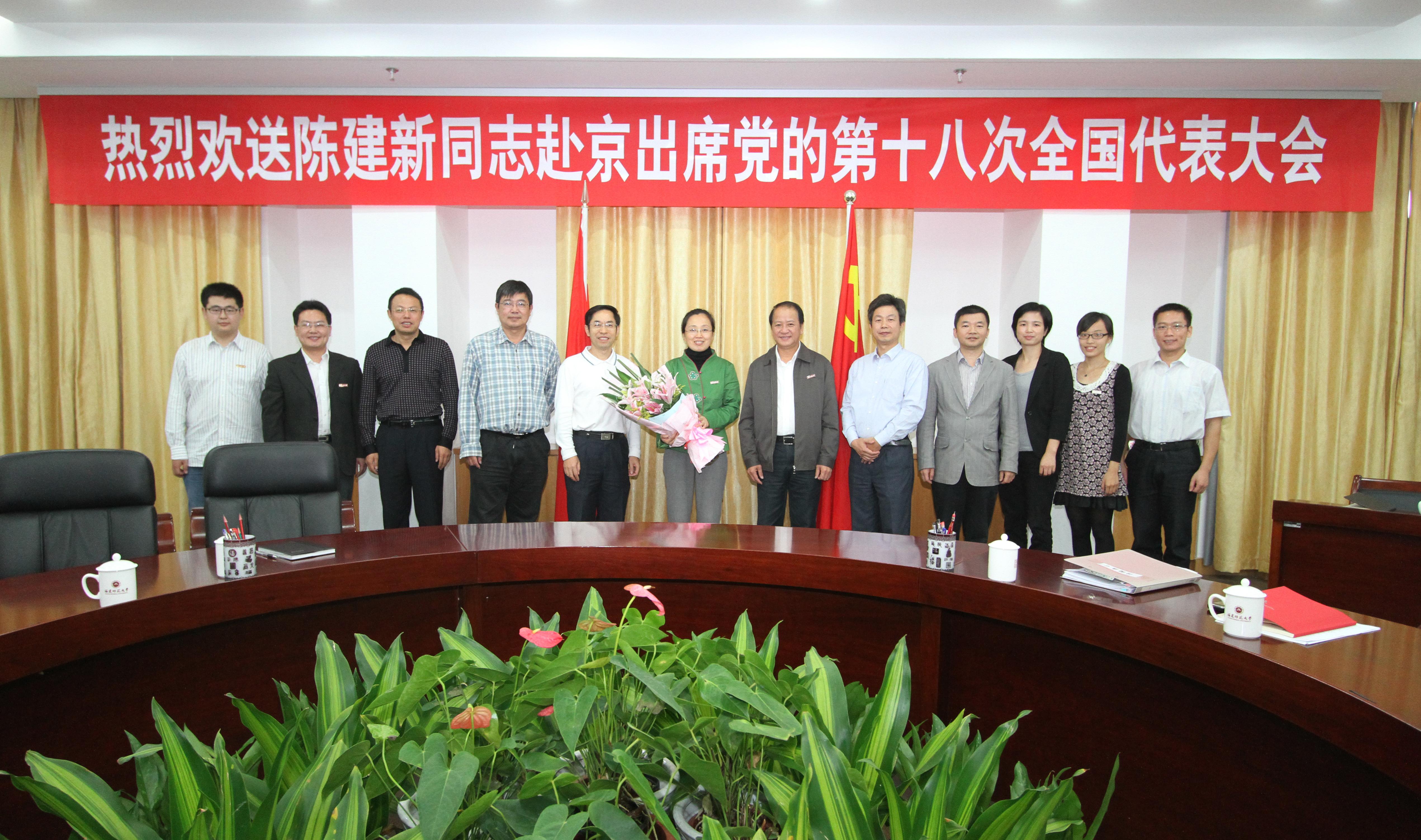 会上,罗萤书记高兴地指出,陈建新同志是我校建校105年来产生的第一位全国党代表,她不仅是陈建新同志个人的骄傲、学院的骄傲,也是学校的骄傲,同时还是我省高等教育系统的骄傲。罗萤书记简要回顾了本次全国党代表产生的过程,他指出,陈建新同志之所以能够在公平、激烈的竞争中脱颖而出,在于陈建新同志身上集中了知识分子、高校教师的许多优秀品质,体现了党员教师的先锋模范作用;在于她能够爱岗敬业、扎实工作,取得了突出的业绩;在于她以实际行动影响和带动团队成员、广大师生积极进取,推动学院、学校形成奋勇争先、比学赶超的浓厚氛围。会上,罗书记也对陈建新同志提出了殷切的希望,希望她能够认真履行代表职责,展现高校教师风采,并希望她能够深刻领会会议精神,回校后向广大师生传达大会精神,分享会议成果。