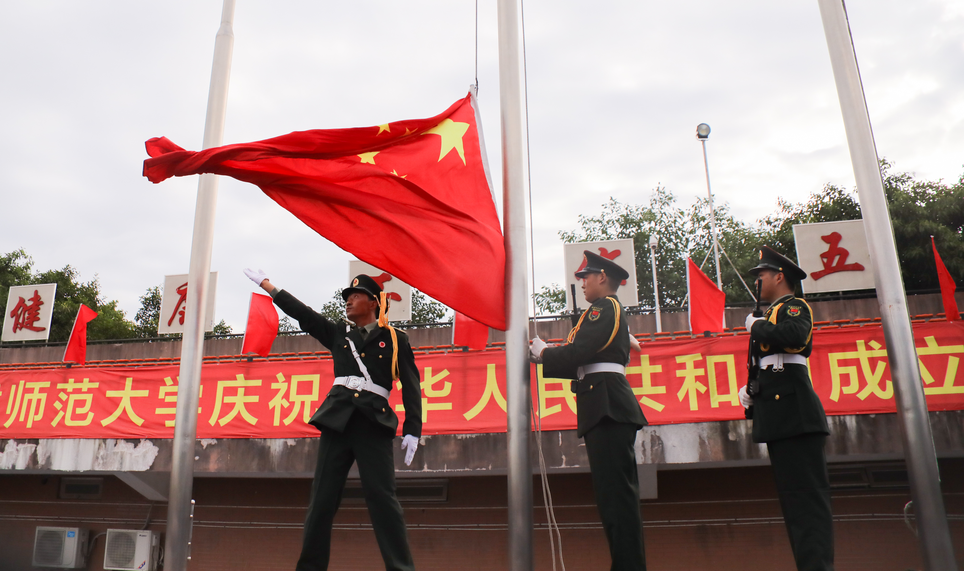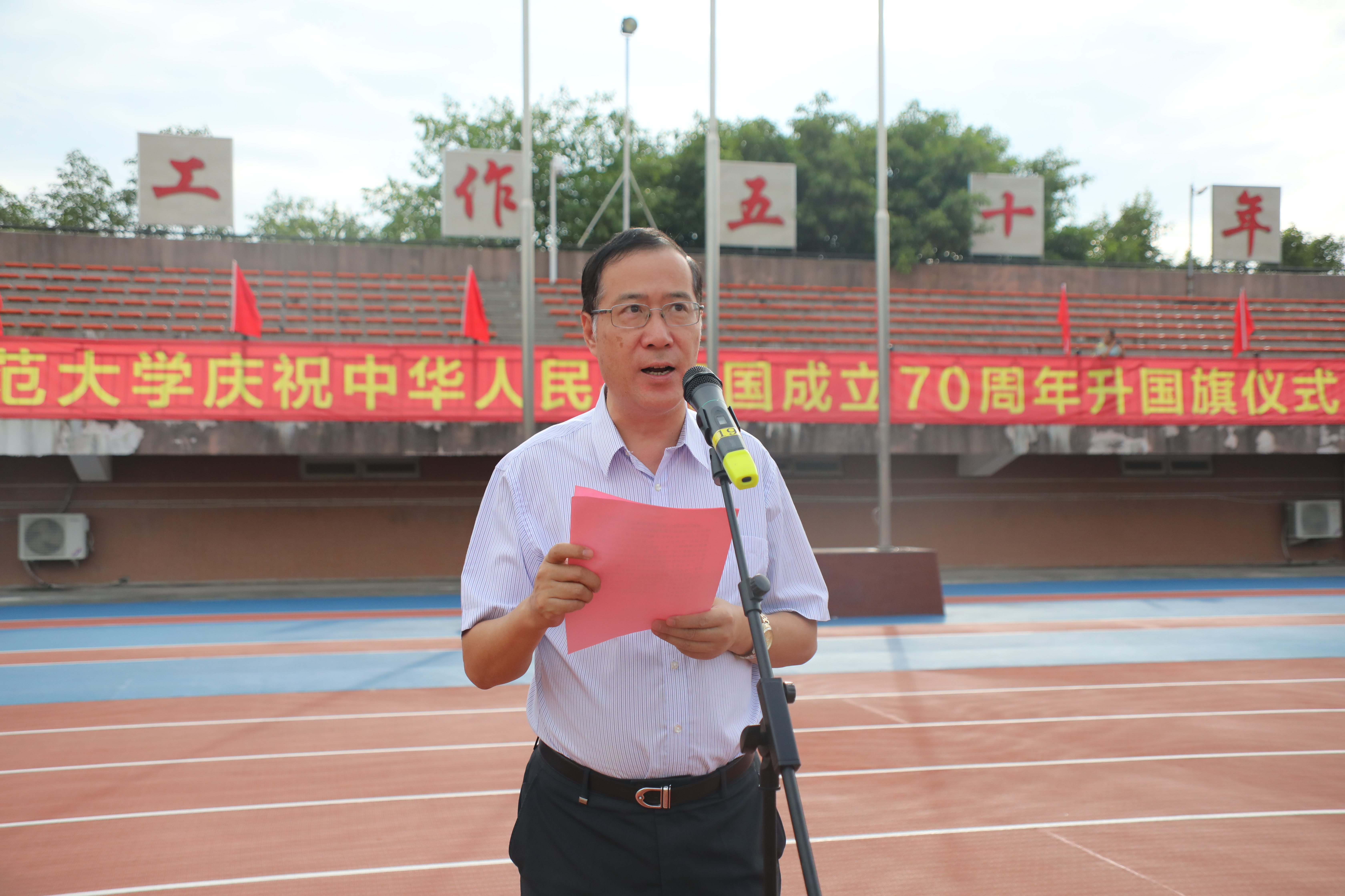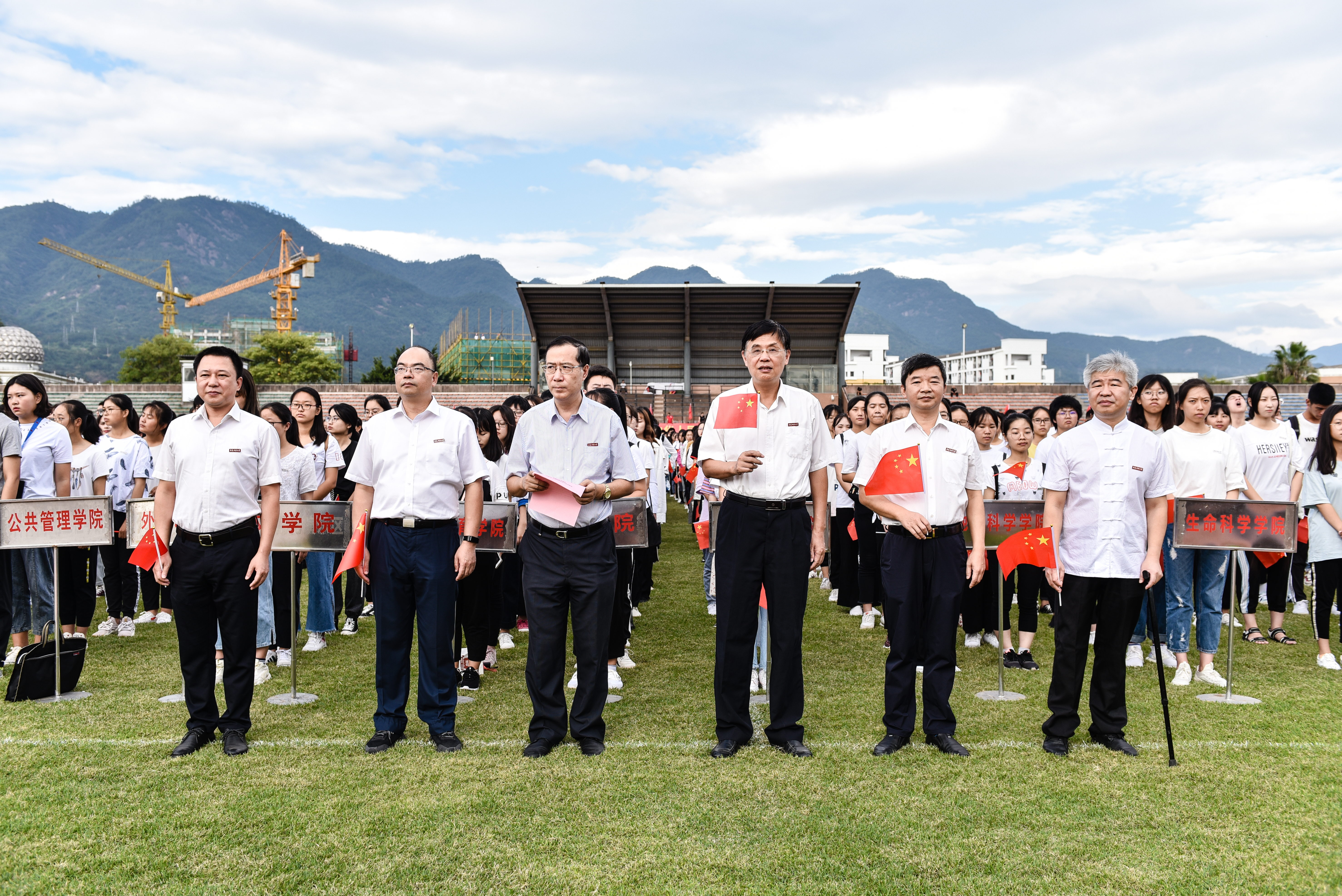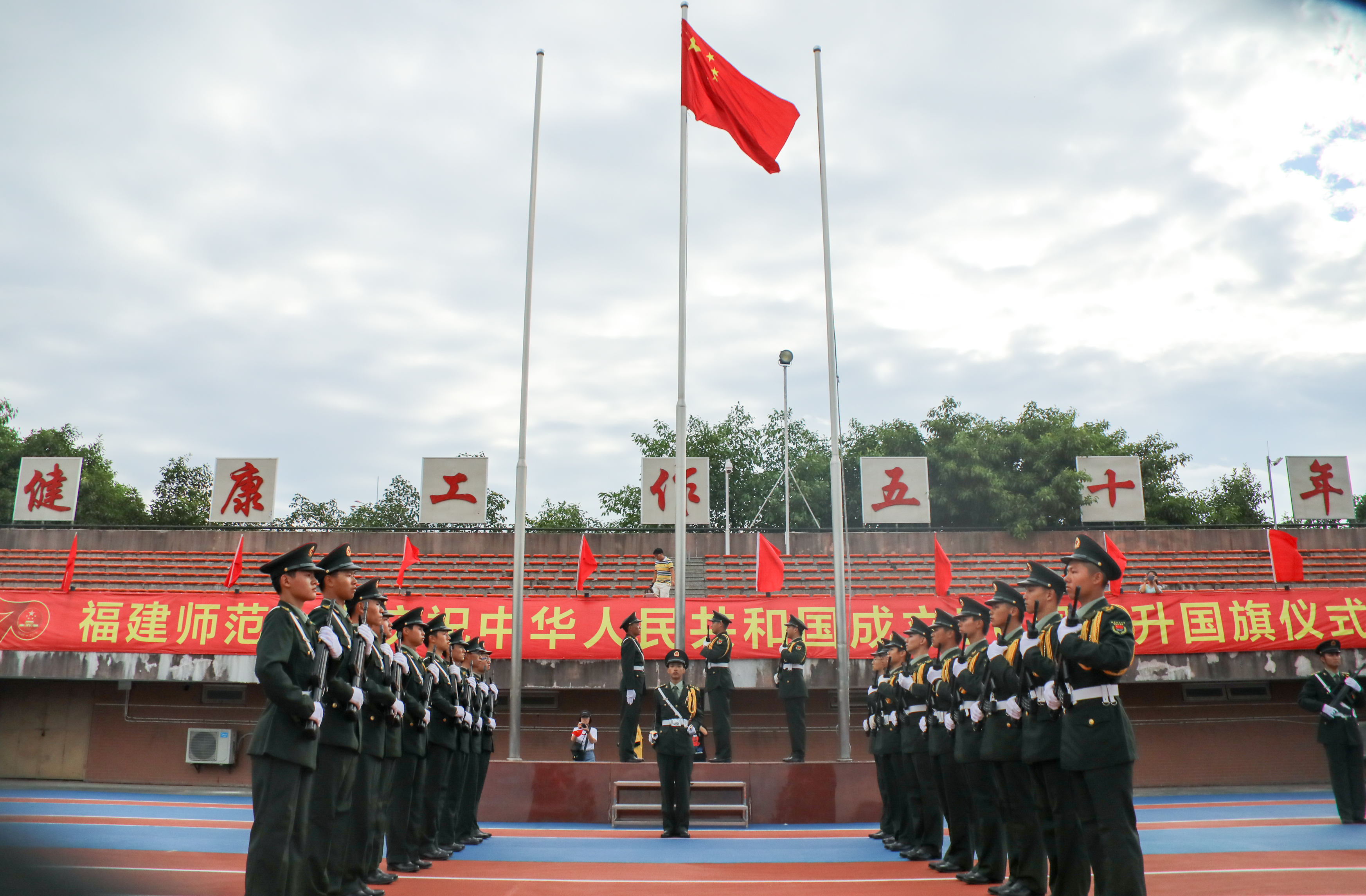10月1日上午,我校在旗山校区东区田径场隆重举行庆祝中华人民共和国成立70周年升国旗仪式。校领导李宝银、王长平、叶燊、黄清波、赖海榕、涂荣,机关部处、馆、中心、集团、医院、公司主要负责人,各学院党政主要负责人、分管学生工作负责人,全体辅导员,学生代表,共计1000余人参加了活动。校长王长平主持仪式。