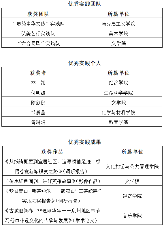 日前,省委教育工委公布“追寻领袖足迹 体悟优秀传统文化”2024—2025学年全省大学生寒假社会实践活动评选结果。我校获评优秀组织单位,马克思主义学院“赓续中华文脉”实践队等3个团队获评优秀实践团队,经济学院林翊等5位师生获评优秀实践个人,文学院《传承红色闽剧,讲好英雄故事》等4个作品获评优秀实践成果。
