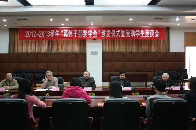 颁发仪式暨受助学生座谈会于3月13日下午在旗山校区第十会议室举行。校关工委主任陈锋,离休干部党总支副书记张卿,陈天寿老师,离退处、学工处负责人和受助学生参加了仪式。