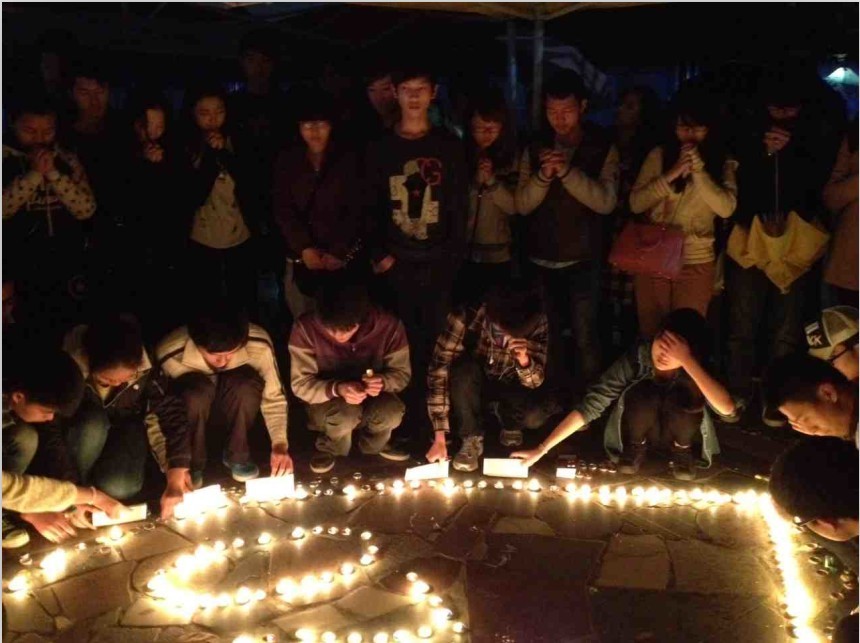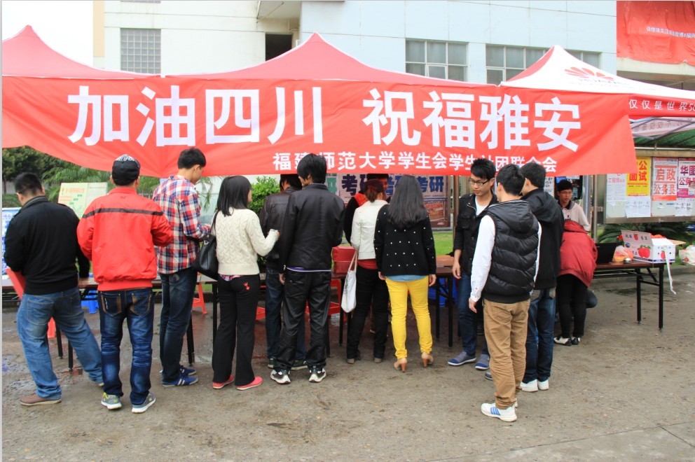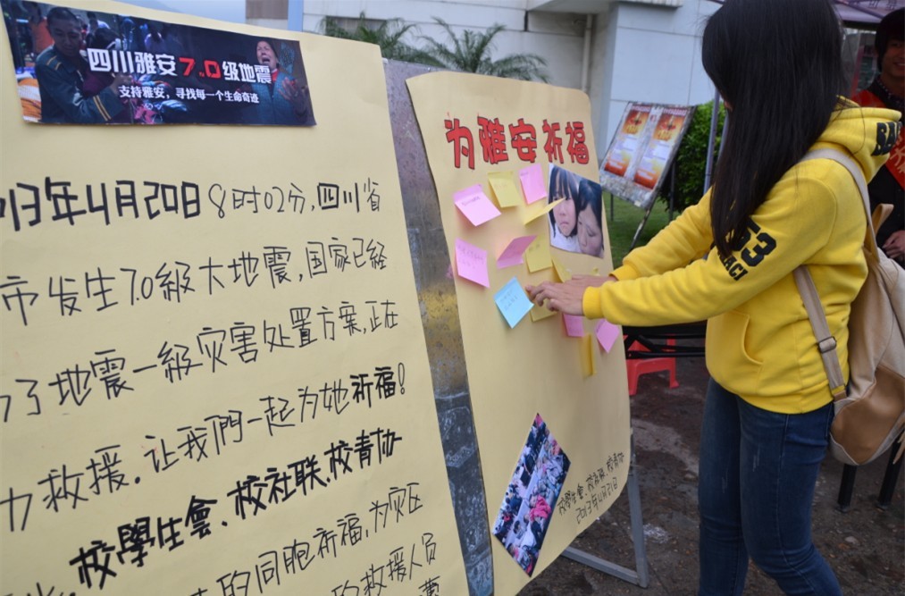 4月20日8时,四川雅安县发生7.0级强震。消息传来,校学生会、校学生社团联合会、校青年志愿者协会联合在官方微博上发起倡议,号召同学们积极行动起来,踊跃为灾区人民捐款,以实际行动提供帮助。20日当晚,校学生社团联合会在旗山校区共青团广场组织了祈福活动,同学们用蜡烛摆出心形和“420”数字造型,吸引大批同学驻足加入,共同为灾区祈福。校学生会发布“我在星空下载游戏推荐安卓,我来自……,我为雅安祈福!”的微博,立刻成为关注和传播的焦点。