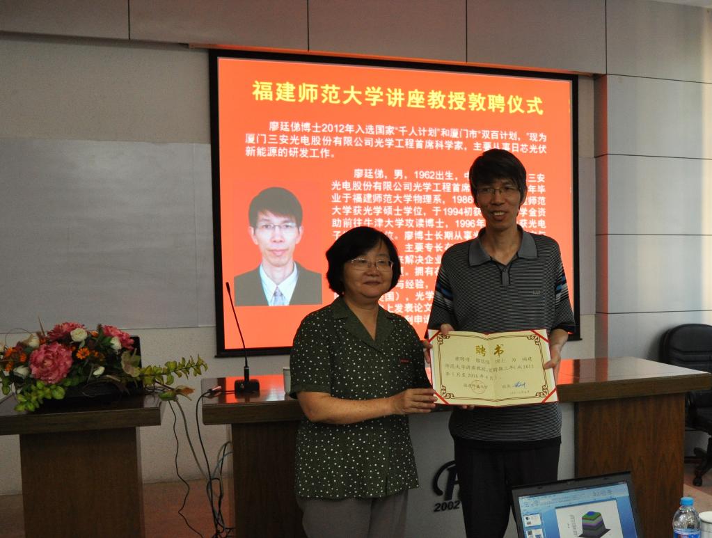 8月4日下午,我校在仓山校区物光大楼学术报告厅举行敦聘仪式,聘任我校校友、厦门三安光电股份有限公司光学工程首席科学家廖廷俤博士为我校讲座教授。
