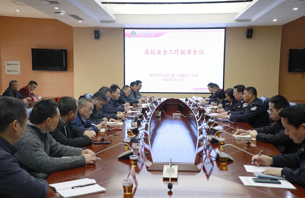 会议于2月17日在我校旗山校区举行,福州市公安局上街(高新区)分局局长余根钦、副局长郑德宁,省教育厅安全处处长林正泳,省公安厅、市公安局相关部门负责人,市公安局上街(高新区)分局治安、刑侦、国保、巡特反恐、网安大队及辖区各派出所负责人,上街(高新区)交警大队负责人,大学城各高校保卫部门负责人以及大城办、上街镇代表参加联席会议。我校党委书记潘玉腾、副书记涂荣应邀出席。会议由福州市公安局上街(高新区)分局政委叶炜琳主持。