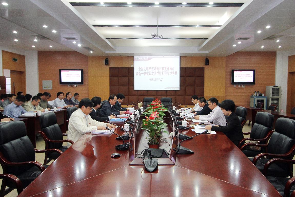 校党委书记罗萤代表学校对考评组表示欢迎,并简要介绍了我校文明创建工作情况。他指出,学校高度重视全国文明单位创建工作,按照“精神文明重在建设”的方针,不断优化精神文明创建的内容、形式、载体和机制,总结经验、查找不足,切实改进。一是坚持以学雷锋活动为核心,深入开展志愿服务活动;二是坚持以社会主义核心价值体系建设为根本,深入推进思想道德建设;三是坚持以讲文明树新风为重点,持续提升校园文明程度;四是坚持以校园文化活动为载体,不断满足师生精神文化需求;五是坚持以服务型校园建设为抓手,有效提升科学管理水平;六是坚持以山水学村建设为目标,积极营造优美的校园生态环境。