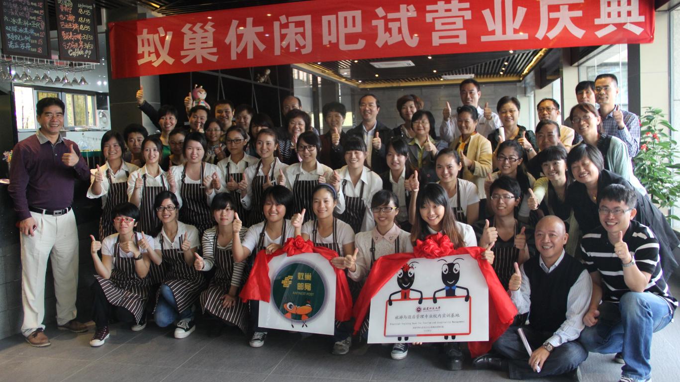 11月11日,我校旅游与酒店管理专业校内实训基地“蚁巢休闲吧”举行试营业仪式。省旅游局陈扬标副局长,武夷山天心阁酒店有限公司陈永佟总经理,闽侯县邮政局、大学城支局负责同志,我校副校长李敏,有关部门负责人,旅游学院师生和来自全校的50名蚁巢“正能量超人”学生志愿者出席仪式。