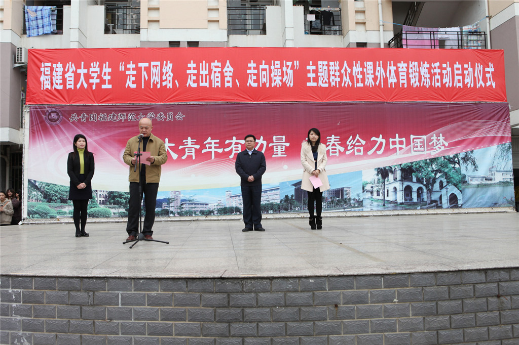 日前,福建省大学生“走下网络、走出宿舍、走向操场”主题群众性课外体育锻炼活动启动仪式在旗山校区举行。团省委副书记兰明尚,我校副校长许明,省学联主席王薇薇,在榕各高校团委书记、学生会主席、学生社团联合会主席,青年学生代表500人参加了启动仪式。