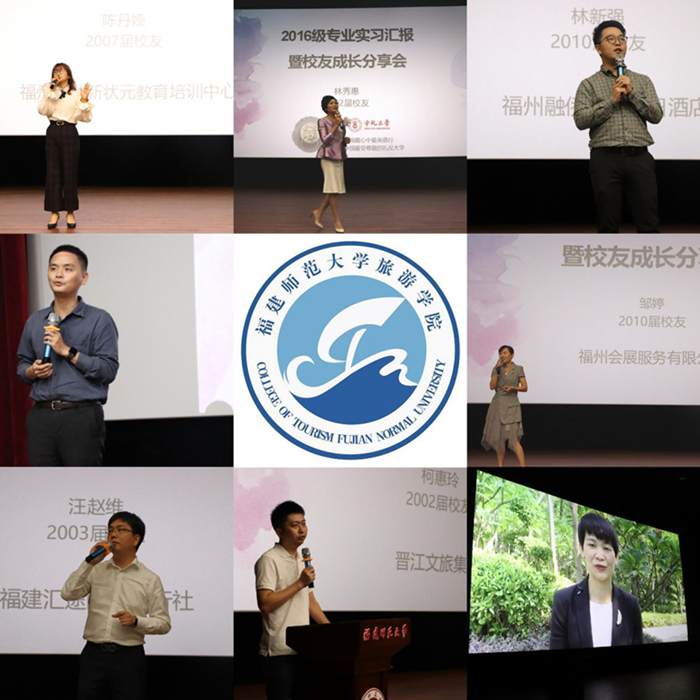 1023日下午,旅游学院在旗山校区星雨剧场举办2016级专业实习汇报暨校友成长分享会。教务处副处长杨发福、各实习单位代表、优秀校友代表、学院全体教师和2016级、2017级同学共300余人参加了活动。
