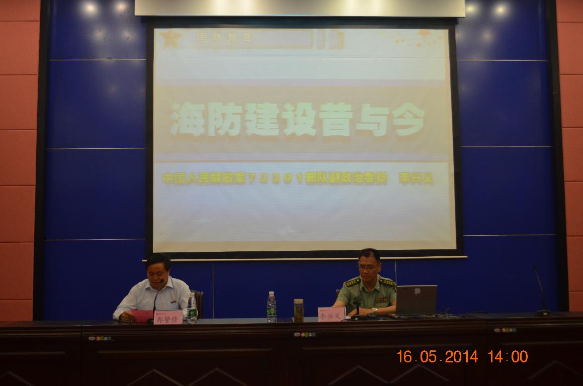 李兴义从海防的相关概念、我国海防建设的历史与现状、海防建设的有关启示、当前东南沿海方向海防建设面临的挑战、对海防建设的几点思考等方面,全面阐述了我国海防建设的历史、现状、面临的挑战及对策。报告深入浅出、分析透彻、资料详实,不仅丰富了师生的国防知识,也进一步激发师生的爱国主义热情。