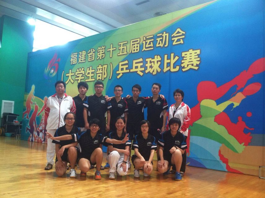 5月30日至6月2日,由省教育厅、省体育局主办的福建省第十五届运动会(大学生部)乒乓球比赛在福州市体育职业技术学院举行。本次大赛有来自全省25所高校的150余名运动员参加。我校代表队(甲A)10名运动员在林学政、王丹虹两位带队主教练的指导下,经过多轮比拼,获得女子团体赛银牌(文学院张晴遥、化学与化工学院覃暄、地理科学学院林铮钰、叶晓棠、人民武装学院陈晨);男子团体赛铜牌(环境科学与工程学院王湃鑫,社会历史学院陈镇国,软件学院刘寓非,人民武装学院陈霖,地理科学学院乔成龙)。此外,张晴遥、覃暄组合获得女双金牌,林铮钰、陈晨组合获得女双银牌,陈霖、王湃鑫组合获得男双银牌,林铮钰获得女子单打铜牌,陈霖获得男子单打第四名,陈镇国获得男子单打第六名。