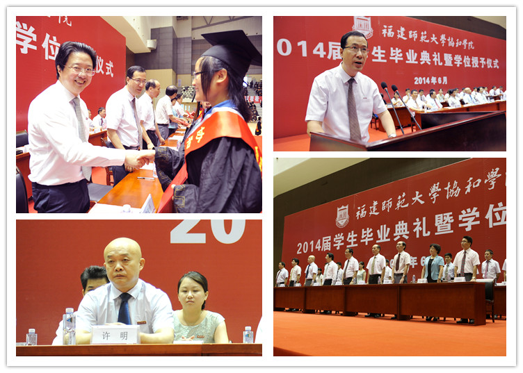 仪式于6月23日上午在福建省大学生体育馆隆重举行。校党委书记黄汉升,副校长王长平,副校长、学院党委书记许明,校资产经营公司、学校办公室负责人,学院领导袁勇麟、黄跃鹏、林鲁文、王知桂、王进安,学院相关职能部门负责人、各系主任及党总支书记、教师代表、毕业班辅导员、部分毕业生家长以及协和学院全体2014届毕业生3200多人参加了典礼仪式。