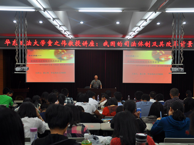法学院采取“请进来”与“走出去”相结合、内部培训与外部交流相结合、理论学习与实践服务相结合的方式,安排了一系列师生学习会、讲座、培训、宣讲等活动,于10月27日晚邀请华东政法大学教授、法治中国建设研究中心主任、中国宪法学研究会副会长、上海市宪法学研究会会长童之伟来校作了题为“我国司法体制及其改革前景——对中共四中全会《决定》相关部分的解说”的专题讲座。此外,应兄弟院校、地方相关共建单位的邀请,法学院充分发挥学科专长和专业优势,组建了党的十八届四中全会宣讲团,安排部署一批教授“走出去”,宣讲全会精神。法学院研究生也充分发挥专业特长,应邀前往共建司法部门开展学习交流座谈和学习宣讲团日活动,在社会实践中深化理论学习。