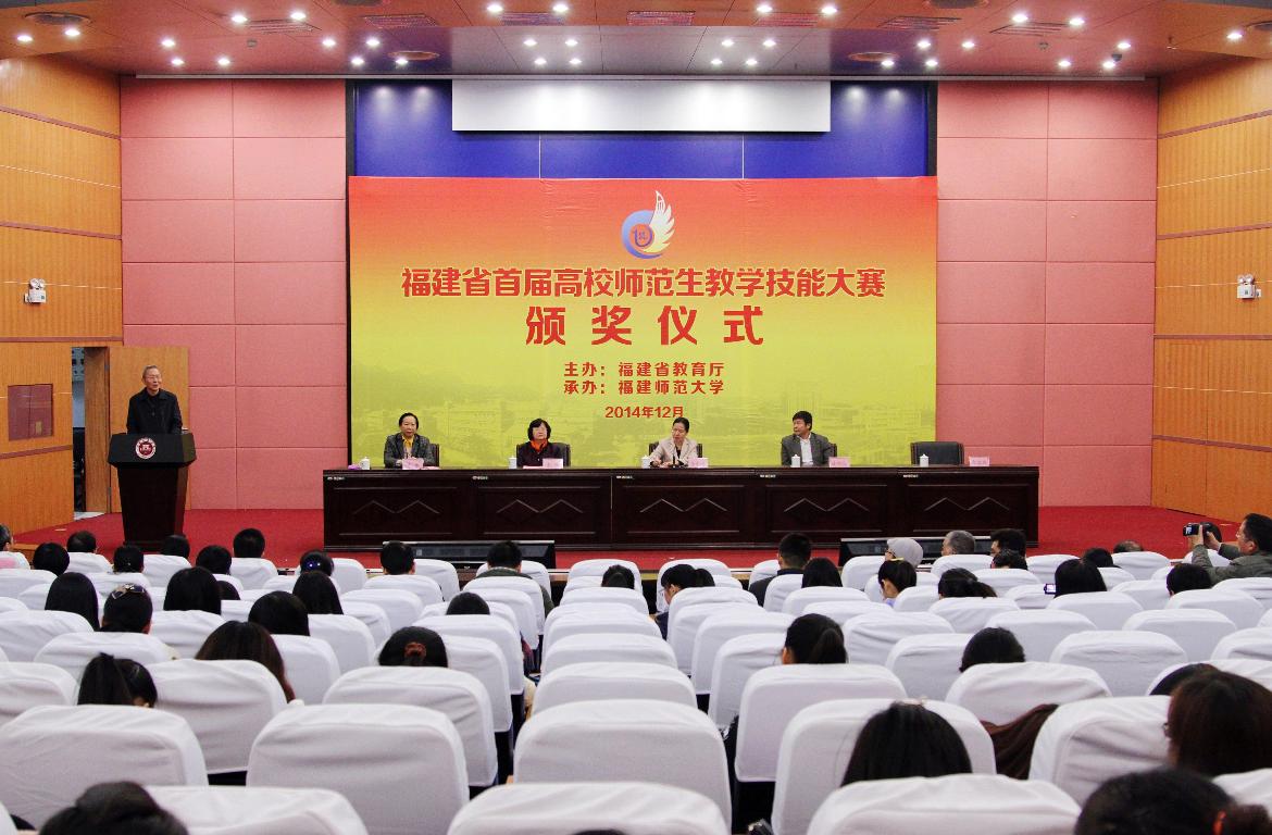 大赛颁奖仪式于14日下午在旗山校区学术大讲堂举行,省教育厅李金莲巡视员、省教育厅人事处陈明庆处长、省教育厅学生处朱敏处长,我校李敏副校长,教师教育学院负责人等出席颁奖仪式,并给获奖选手、获奖单位颁奖。