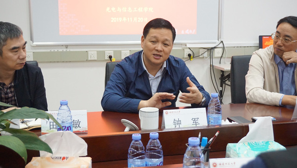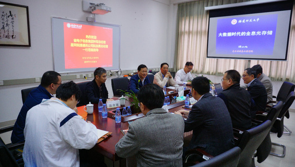11月20日上午,省电子信息集团总经理钟军、星网锐捷通讯公司总经理阮加勇一行到我校光电与信息工程学院专题调研全息光存储技术项目进展情况。副校长杨玉盛、国家重点研发计划重点项目首席专家谭小地教授、校科技处和光电与信息工程学院有关负责人以及项目组成员等参加了座谈会。