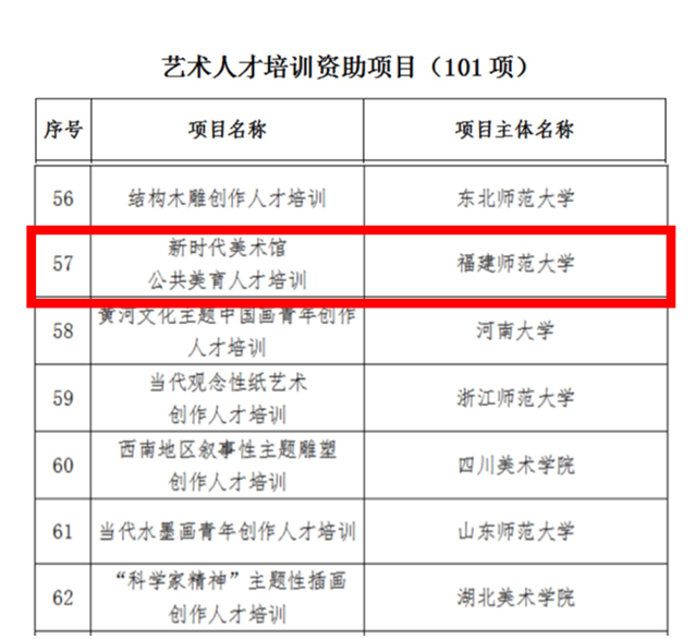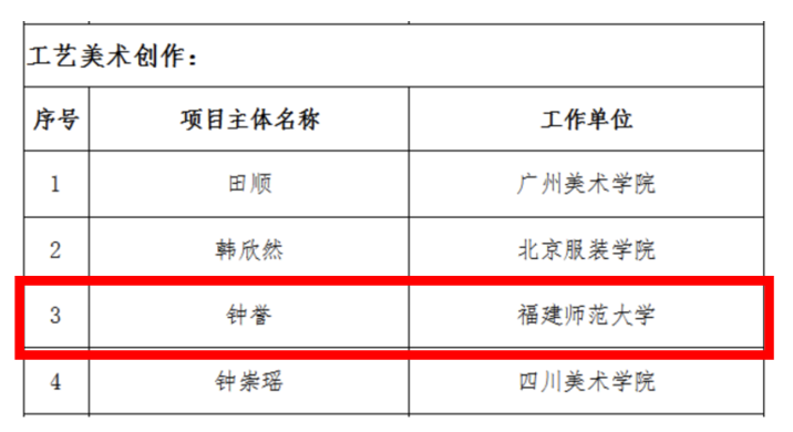 近日,国家艺术基金官网发布《国家艺术基金(一般项目)2023年度资助项目名单》。我校美术学院胡泊教授主持的《新时代美术馆公共美育人才培训》获批艺术人才培训资助项目,资助经费为90万元;杨伟欣(油画创作)、钟誉(工艺美术创作)获批青年艺术创作人才资助项目,资助经费均为10万元,获资助经费总额为我校历年最高。