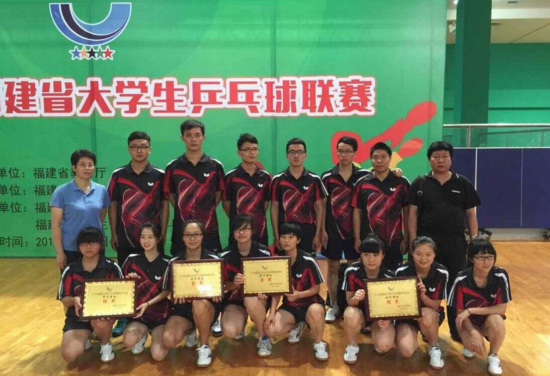 我校普高组和体育专业组14名运动员在林学政、王丹虹两位带队主教练的指导下,经过多轮比拼,获得普高组女子团体赛金奖(文学院张晴遥、法学院陈嘉箴、地理科学学院林铮钰、美术学院苏轶群、材料科学与工程学院谢婷婷),普高组男子团体赛金奖(环境科学与工程学院王湃鑫、人民武装学院陈霖、地理科学学院乔成龙);体育专业组女子团体赛银奖(体育科学学院王榕、夏博雯、李利利),体育专业组男子团体赛银奖(体育科学学院蔡慈兴、向祖兵、谷春强)。此外,普高组中的陈霖、王湃鑫组合获得男子双打第三名,张晴遥获得女子单打第三名,陈霖获得男子单打第三名;体育专业组中的王榕、夏博雯组合获得女子双打第三名,王榕获得女子单打第四名,蔡慈兴、向祖兵获得男子双打第五名。