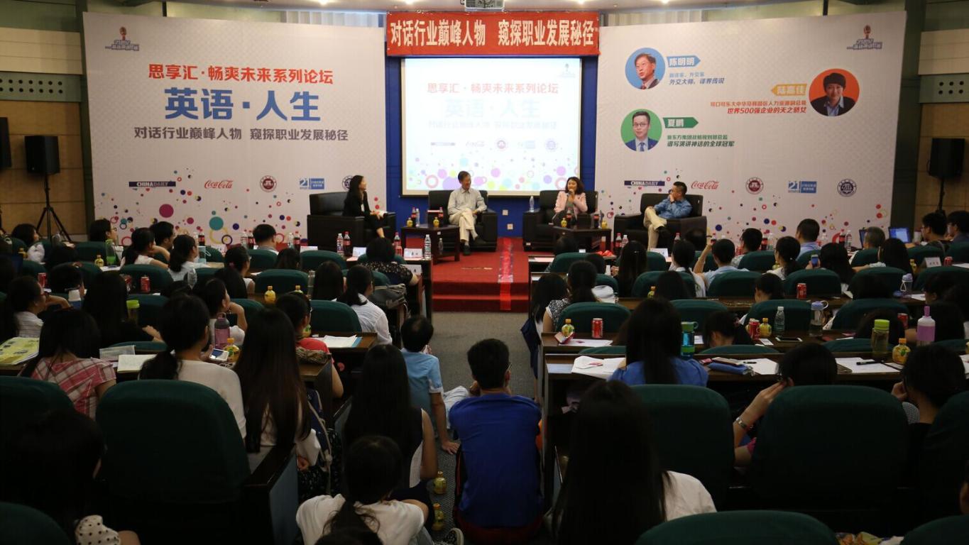 活动中,陈明明大使结合自己担任党和国家领导人翻译和驻外大使的丰富经历,生动诠释语言文化对职业生涯的影响。他建议同学们广泛涉猎外文资料,开阔视野,增强自信,不断提高公众演讲能力。可口可乐大中华及韩国区人力资源副总裁陆嘉佳、新东方集团战略规划部总监夏鹏两位主讲嘉宾也分别围绕“英语·人生”的主题做了精彩演讲。