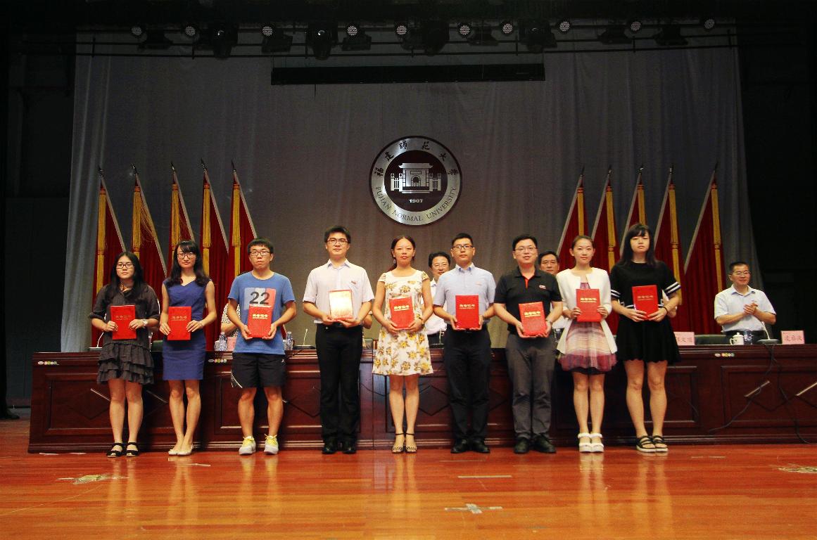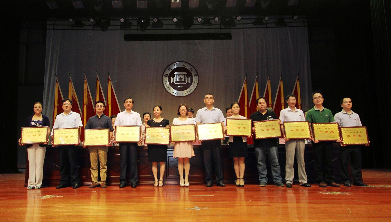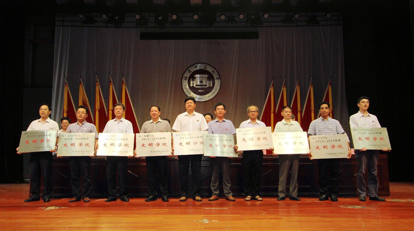 汪文顶副校长宣读了表彰名单。主席台领导为获奖单位代表和个人颁奖。会议表彰了2013-2014年度精神文明建设先进集体和个人、2014年度新闻宣传工作先进单位、2014年度校报信息工作先进个人和优秀学生记者。经济学院等10个学院荣获“文明学院”称号,学校办公室等10个部处荣获“文明处室”称号,李苑7(教育学院)等10座楼宇荣获“文明楼”称号,李苑7-209等90间学生宿舍荣获“文明宿舍”称号,随园餐厅等5个餐厅荣获“文明餐厅”称号,黄一菁、刘聃等30名师生荣获“精神文明建设先进个人”称号,协和学院等12个单位荣获“新闻宣传先进单位”称号,王源等5位教师荣获“校报信息先进个人”称号,