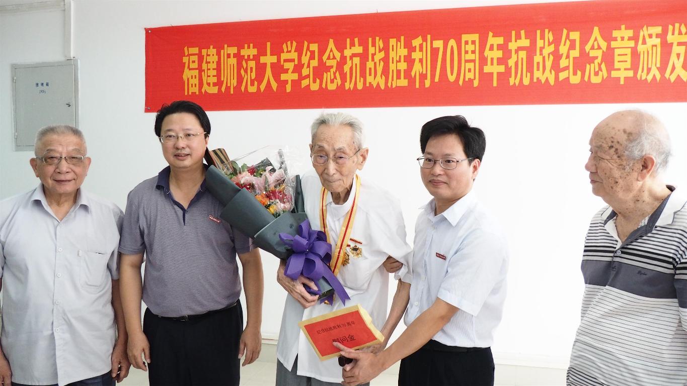 随后,黄汉升书记为每位到场的我校抗战老战士、老同志发放抗战纪念章、敬献鲜花,为我校抗战离休老干部发放慰问金,并和他们一一合影留念。