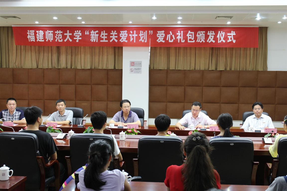 下午4点,校领导黄汉升、王长平、叶燊,学校办公室、学工部(处)负责人和2015级新生代表在旗山校区第十会议室参加“新生关爱计划”爱心礼包颁发仪式。校领导共同为特困新生代表发放了爱心大礼包,并与他们合影留念。