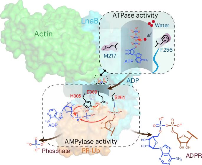 嗜肺军团菌是导致人类军团病的致病菌,其感染肺巨噬细胞并在宿主细胞内形成独特的膜泡结构来实现生存和繁殖。嗜肺军团菌利用SidE家族效应蛋白催化一种不依赖E1和E2的非典型泛素化过程,促进嗜肺军团菌膜泡的成熟。该非典型泛素化在对应的特异去修饰效应蛋白DupA/B的作用下产生具有细胞毒性的磷酸核糖化泛素分子(PR-Ub)。去年,我校生命科学学院欧阳松应团队与美国普渡大学罗招庆教授团队合作揭示了军团菌通过效应蛋白LnaB和MavL催化的级联反应,维持感染细胞内的泛素稳态。其中,LnaB是一种依赖于宿主肌动蛋白的新型腺苷酸化酶(Phosphoryl-AMPylase),催化PR-Ub磷酸根的腺苷酸化(AMPylation)修饰生成ADPR-Ub。该工作解析了效应蛋白LnaB的系列复合物结构,详尽地解析了LnaB通过宿主肌动蛋白依赖性激活,催化PR-Ub发生磷酰基腺苷酸化反应的详细分子机制。该工作揭示了腺苷酸化修饰反应的新型催化机制,拓展了对酶催化机制的理解,同时深化了嗜肺军团菌感染致病机制的认识,为研究SHxxxE家族毒素的作用机制奠定了基础,也为开发新型抗感染药物提供了重要的理论依据。