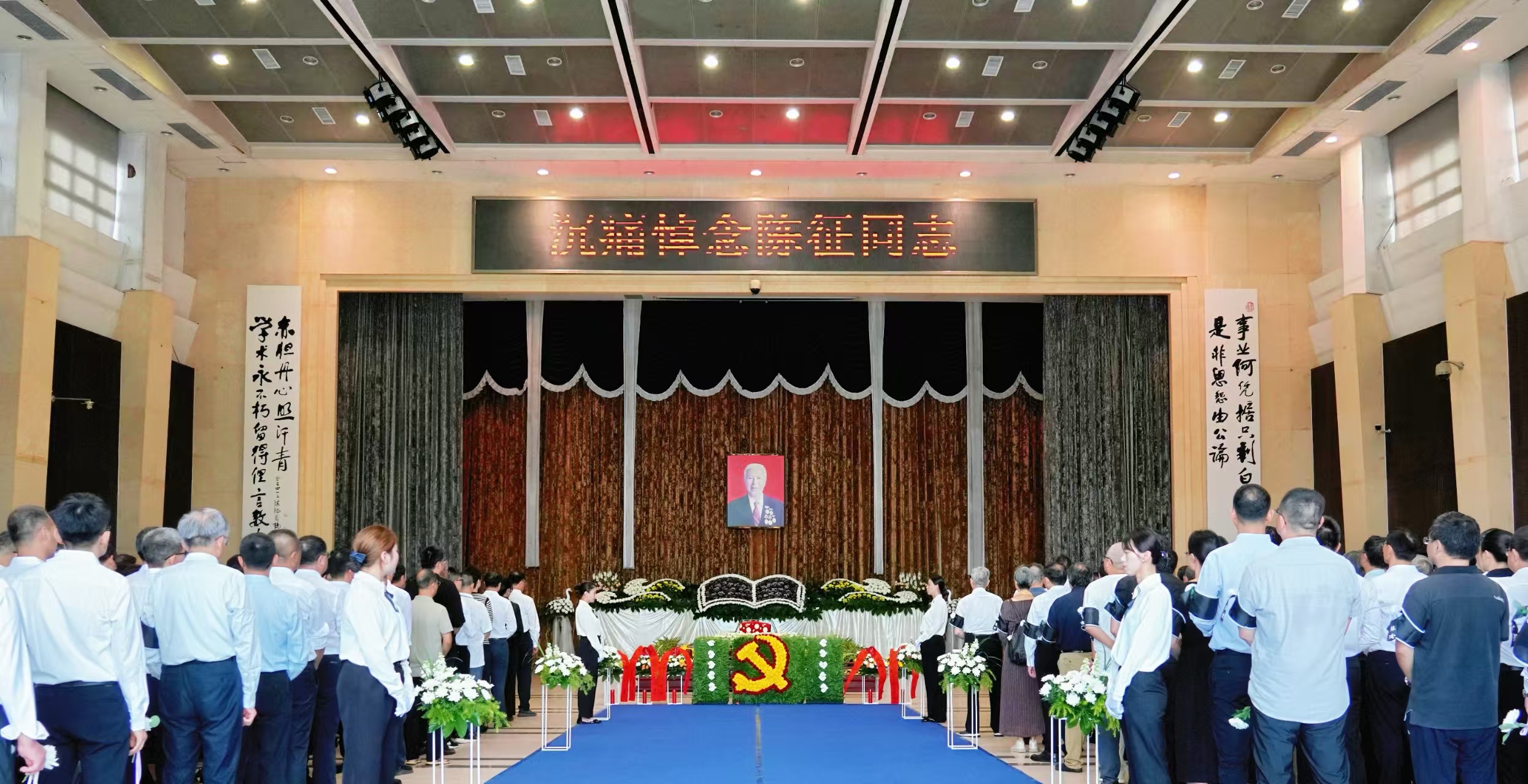 随后,到场领导、亲朋友好、各界人士、校友和师生代表等怀着沉痛的心情依次向陈征同志遗体肃立默哀、三鞠躬后,缓步绕灵作最后送别,并向家属表示慰问。