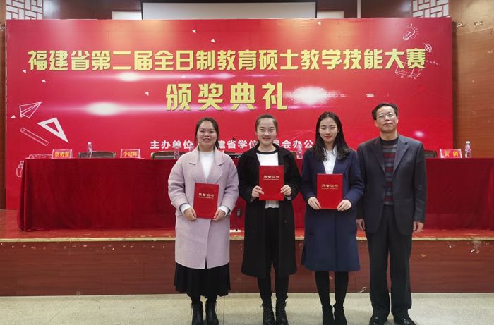 128日,由福建省学位委员会办公室主办的福建省第二届全日制教育硕士专业教学技能大赛决赛在闽南师范大学举行。来自省内三所高校的54位选手参加了决赛。经过教学设计、模拟教学和专家提问三个环节的比试,最终决出学科教学(语文)、学科教学(数学)、学科教学(英语)、学科教学(政治)和小学语文、小学数学等6个专业领域的一、二、三等奖。文学院学子凭借良好的专业素质,赢得评委一致认可。文学院2018级学科教学(语文)专业硕士研究生陈锭梅、林风、刘思齐获得二等奖;2018级学科教学(语文)专业硕士研究生徐才茜、杨陈钰获得三等奖;冯直康、李勤、刘心、雷文学获评“优秀指导老师”荣誉称号。