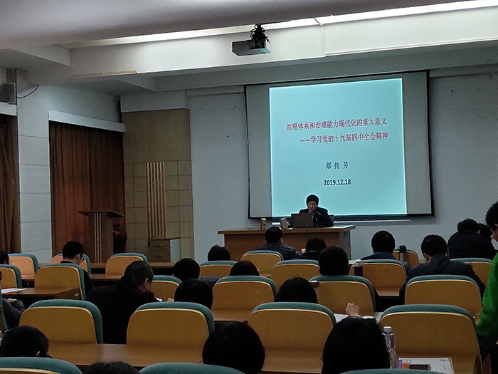 12月18日下午,物理与能源学院在理工3-102召开党的十九届四中全会精神学习会。邀请中央马克思主义理论研究和建设工程首席专家、我校马克思主义学院教授郑传芳作题为《国家治理体系和治理能力现代化的重大意义——学习党的十九届四中全会精神》辅导讲座。学院全体教职工、学生党员代表参加了学习会。