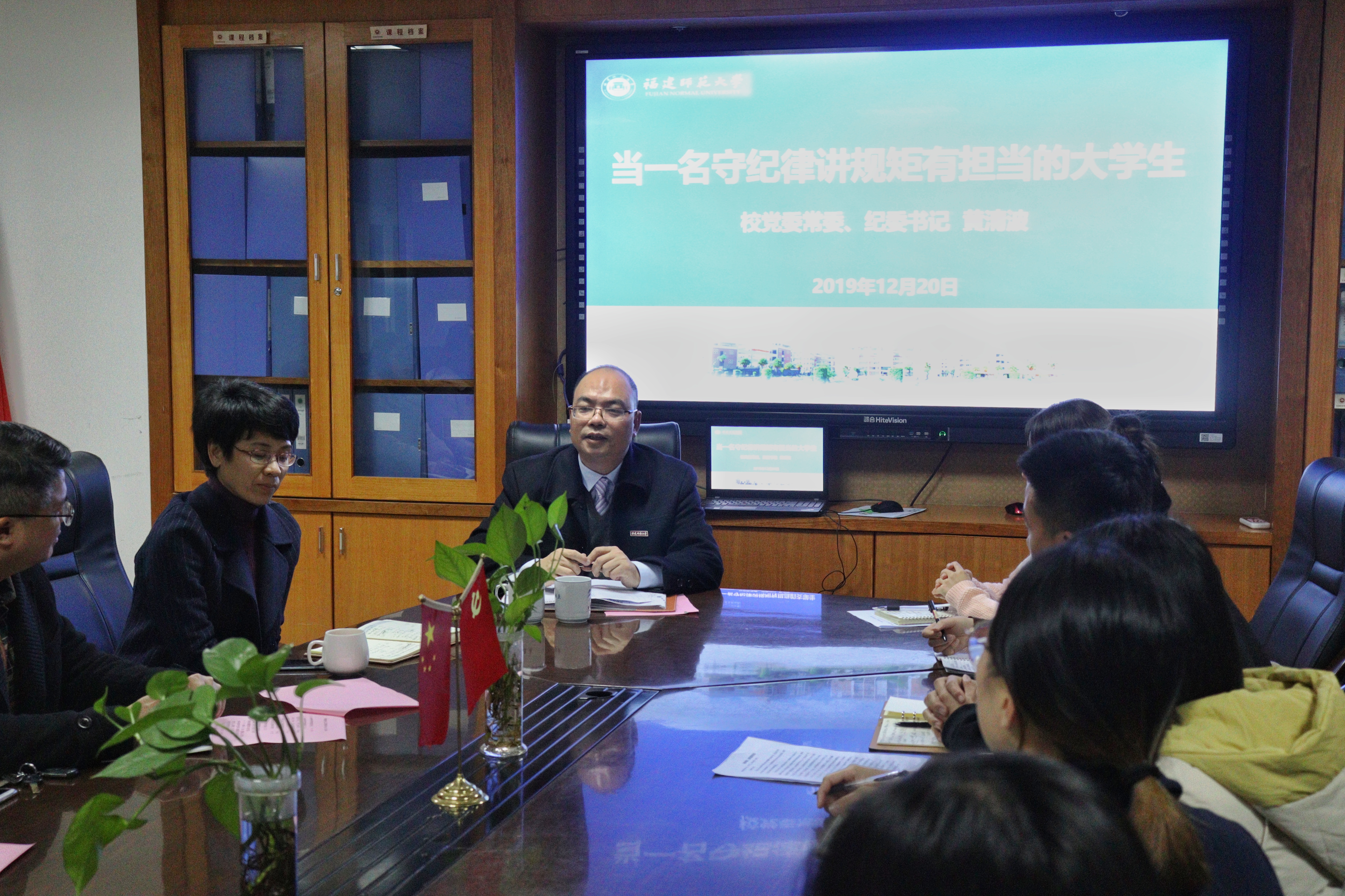 12月20日晚,校纪委书记黄清波以《当一名守纪律讲规矩有担当的大学生》为题,为生命科学学院的学生党员上思政课。他结合工作实际和自身援疆经历,指出新时代的大学生,特别是大学生党员,要坚持做到“守纪律、讲规矩、有担当”。他强调,当好一名守纪律讲规矩有担当的大学生,必须从六个方面下功夫,即理论武装要加强、初心使命要牢记、纪律规矩要遵守、党员先锋要发挥、制度规定要执行、支部活动要正常。最后,他还勉励同学们胸怀理想、大胆作为,敢于探索、善于创新,做努力奔跑的追梦者、圆梦者。