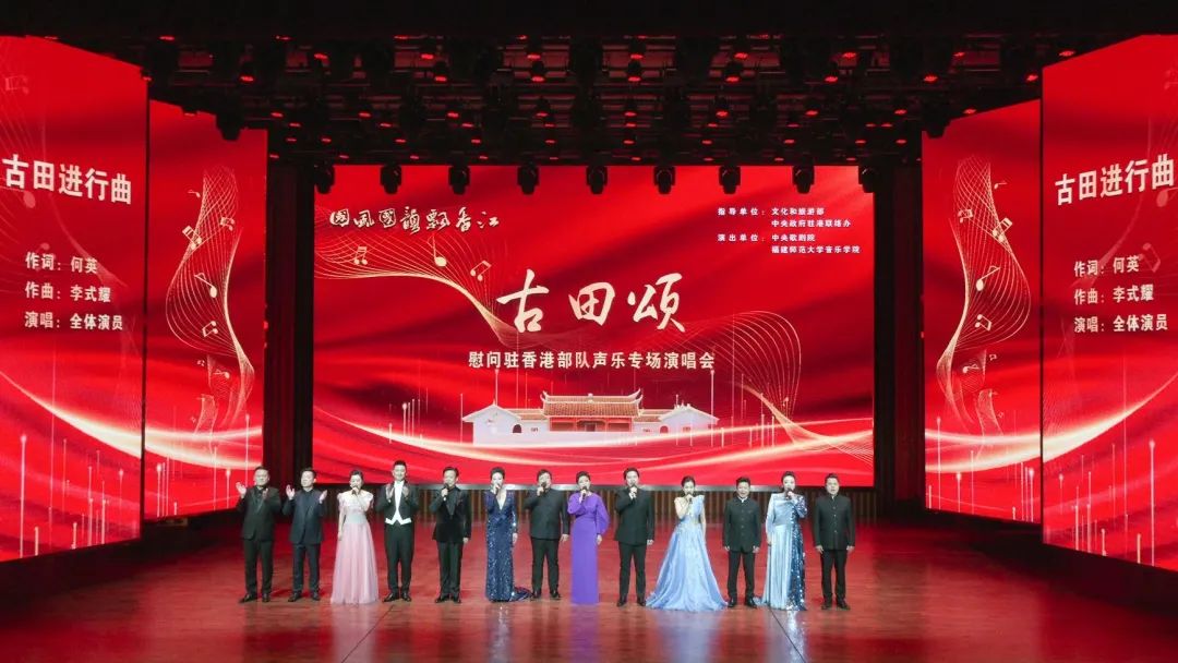 5月9日,由文化和旅游部、中央政府驻港联络办指导,中央歌剧院和我校音乐学院携手走进解放军驻香港部队举办声乐专场慰问演出,为400余名官兵代表表演了何英作词、李式耀作曲的原创组歌《古田颂》。
