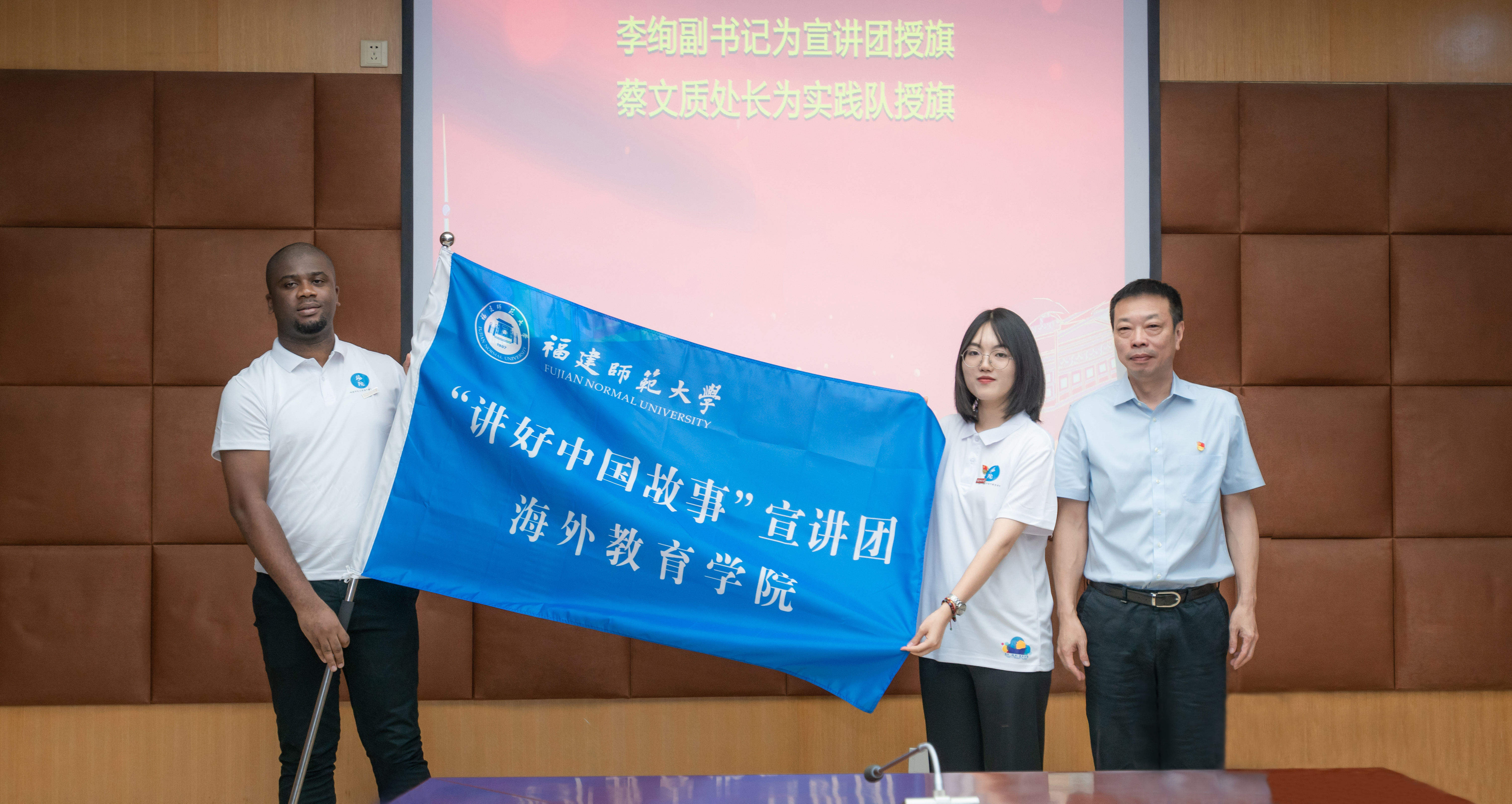 仪式于7月8日在我校旗山校区举行。省外办亚洲处处长蔡文质,我校党委副书记李绚,宣传部、统战部、学工部、国际合作与交流处、校团委、海外教育学院主要负责人,菲律宾红溪礼示大学孔子学院中方代表,留学生、港澳台侨和内地生代表共同参与仪式。李绚副书记为宣讲团授旗。“讲好中国故事”宣讲团由留学生、港澳台侨学生、内地生共15人组成,将开展“看、传、讲、学”系列活动,通过讲好中国故事,充分展现中国发展的光辉历程、伟大成就和宝贵经验,为“让世界更好了解中国”贡献智慧和力量。(海外教育学院)