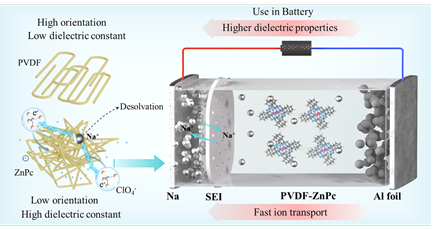聚合物电解质因其优异的柔韧性、工艺可加工性和良好的电化学稳定性,成为最具潜力的候选材料之一。以聚偏氟乙烯(PVDF)为代表的聚合物电解质具有较高介电常数和优异的热稳定性,但其室温离子电导率偏低,成为商业化的主要瓶颈。本研究提出在PVDF聚合物中引入具平面π共轭结构的金属酞菁(ZnPc),通过分子层面的调控实现高性能固态钠电池电解质。ZnPc的引入显著降低了PVDF的结晶取向,使聚合物链段运动更灵活,从而提升离子电导率和机械性能。结果表明,PVDF-ZnPc电解质不仅在室温下表现出较高离子电导率和钠离子迁移数,还实现了稳定的钠沉积/剥离超过2800小时,并在−20至60 °C的宽温区内保持优异电化学性能。该策略为开发高稳定、高安全的全固态钠金属电池提供了新思路。