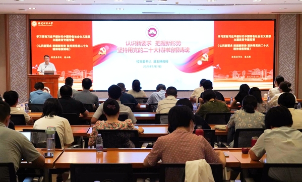 5月31日,校党委书记、校党委主题教育领导小组组长潘玉腾教授面向全校思想政治课教师、二级学院党委副书记、辅导员代表、主题教育领导小组办公室各小组负责人讲授主题教育专题党课。省委第14巡回指导组组长翁启勇、成员危雨童莅临指导。