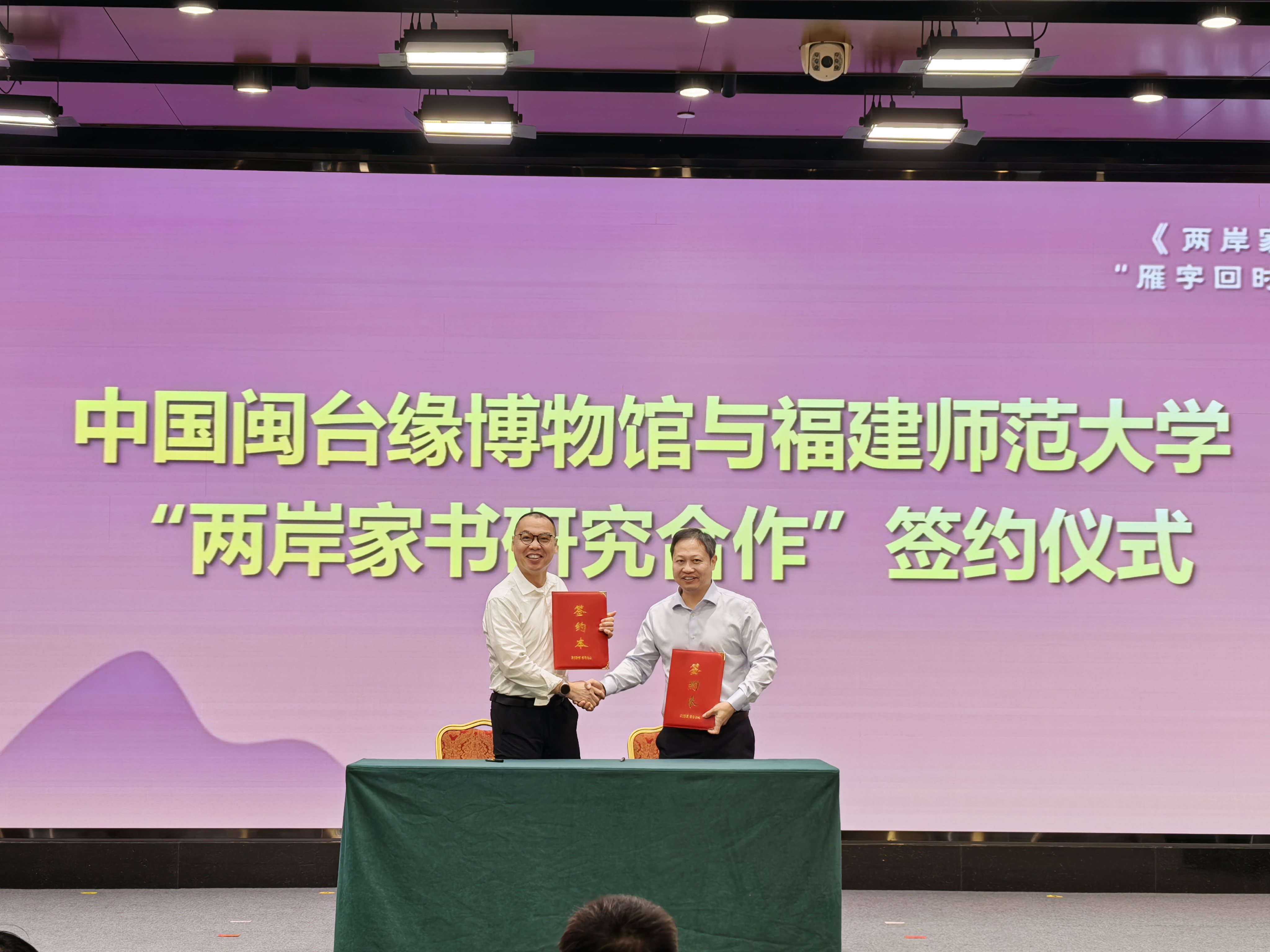 9月23日,在北京台湾会馆召开的“《两岸家书》新书发布会暨‘雁字回时——两岸家书特展’”活动上,副校长方千华代表学校与中国闽台缘博物馆签订“两岸家书研究”合作协议。海峡两岸关系协会副会长孙亚夫等两岸嘉宾百余人见证了签约仪式。此次合作是我校对台文教交流长期积淀的重要成果,展现了双方强强联合、共促两岸文化融合发展的坚定意愿。此次签订协议不仅是两单位深化合作的新起点,更是服务国家两岸融合发展战略、抢救保护两岸共同历史记忆的具体行动。(发展规划处)