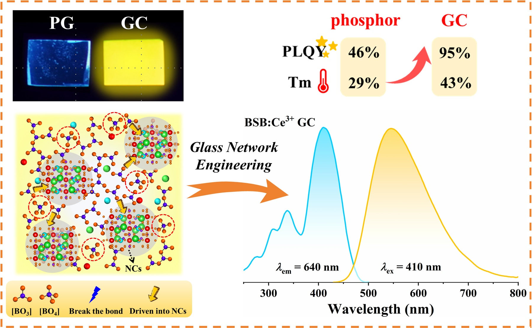 近年来,紫光激发的全光谱照明技术大力发展,以满足高品质、健康照明的需求。然而,关键的黄色荧光粉由于紫光吸收效率低且发光量子效率低,仍处于短缺状态。同时,伴随高功率、高亮度照明需求激增,传统荧光粉材料已难以胜任。在此背景下,兼具玻璃材料的优良稳定性、易加工特性与晶体相的优异发光性能的荧光微晶玻璃材料应运而生。但是,在玻璃中通过原位析晶同时实现高效紫光吸收与高量子效率仍面临显著挑战。