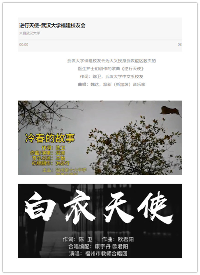陈卫教授毕业于武汉大学中文系,对武汉有着深厚的感情。新冠肺炎疫情爆发以来,她十分关注武汉疫情。为表达对医护人员敬意与赞美, 1月25日、2月4日,她接连创作歌词,并由旅新音乐家魏达、福州教师合唱团艺术指导欧君阳,以及福州十六中学生洪涛分别作曲,形成三首原创歌曲《逆行天使》《白衣天使》《冷春的故事》。歌曲发布后,武汉大学福建校友会、福州市教师合唱团、福州市第十六中毓英合唱团相继使用,社会反响强烈。武汉大学微信公众号还作了专门报道。