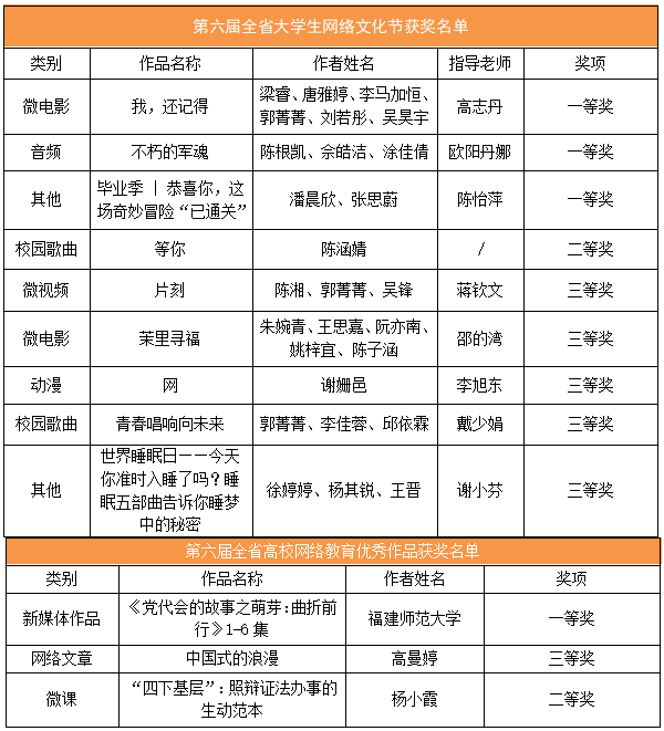 日前,由省委教育工委、省委网信办主办的第六届全省大学生网络文化节和全省高校网络教育优秀作品推选展示活动获奖结果公布,我校推荐参评作品获一等奖4项、二等奖2项、三等奖6项,获奖项目数居全省高校前列。(学生工作部、宣传部)