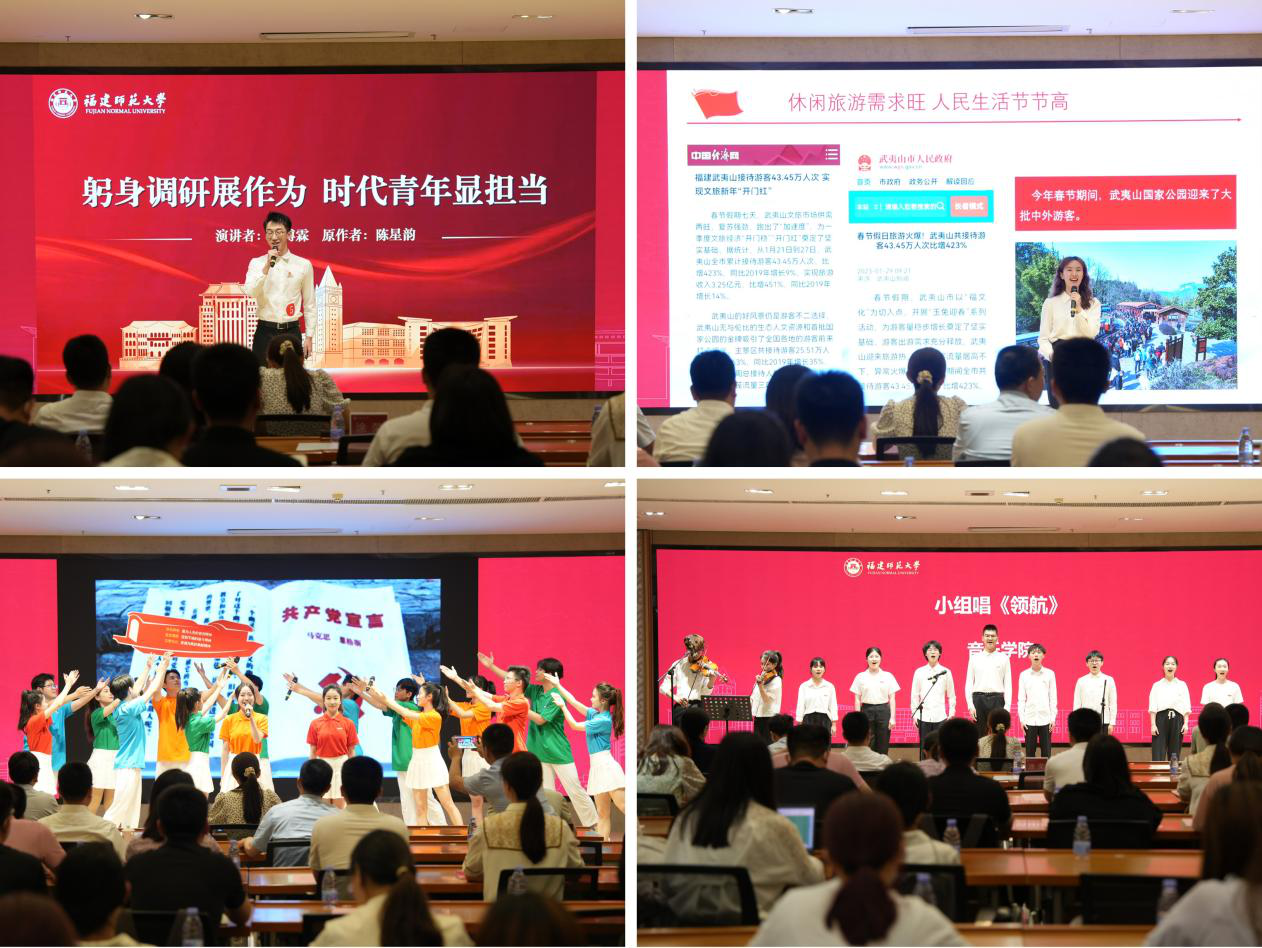 比赛中,来自不同学院和专业的10名参赛选手结合自身经历,围绕家国情怀、乡村振兴、环境保护、青年担当等主题,诠释了对中国共产党为什么“能”、马克思主义为什么“行”、中国特色社会主义为什么“好”的深刻理解,将党的科学理论“大道理”转化为青年大学生喜闻乐见的“小故事”,用朴素真挚的语言表达了我校青年学生坚定不移听党话、跟党走的理想信念。比赛现场,传播学院的同学表演了音诗画《红船映初心》、音乐学院的同学演唱了《领航》等节目。最终,音乐学院吴楠、传播学院李博霖2位同学荣获一等奖。