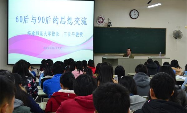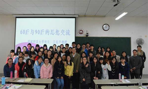 12月16日,王长平校长来到知明1-105教室,为化学与化工学院2014级全体化学(师范)专业本科生上了一堂题为《60后与90后的思想交流》的思政课。