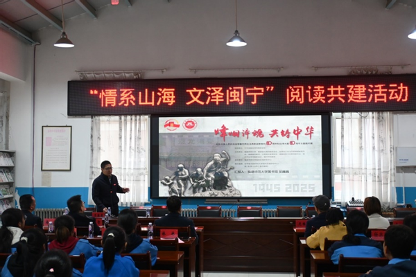 同时,我校图书馆还联合宁夏师范大学图书馆、我校研究生支教团,在原州区杨郎九年制学校开展“情系山海、文泽闽宁”阅读共建活动。活动中,我校图书馆向原州区教育系统捐赠500余册图书。吴巍巍馆长以“‘烽烟淬魂共铸中华’——纪念抗战胜利暨世界反法西斯战争胜利80周年”为题开展讲座。
