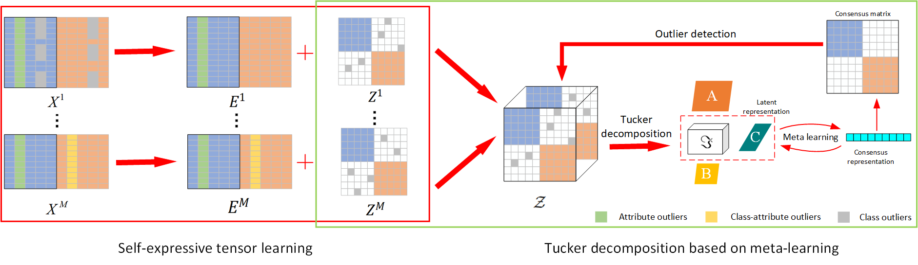 研究成果二:课题组提出了一种基于低秩Tucker分解与元学习的全新框架LRTDM。该方法通过低秩Tucker分解精准刻画多视图自表达张量的低秩结构,因子矩阵与核心张量不仅能够有效保留各视图的潜在结构特征,还能揭示跨视图的共享信息。在此基础上,研究引入元学习,将视图特定潜在特征的学习与融合建模为双层嵌套优化问题,并采用交替求解策略进行高效训练,从而显著提升了一致性结构的恢复能力。在异常检测阶段,模型联合利用潜在表示恢复得到的一致性矩阵与自表达过程中的误差矩阵进行判别,更加准确地识别多视图环境下的异常样本。相关研究成果论文《Low-rank Tucker decomposition for multi-view outlier detection based on meta-learning》已发表在计算机科学与人工智能领域的国际权威期刊《Information Fusion》,该期刊属于中科院一区TOP期刊,2025年最新影响因子为14.8。